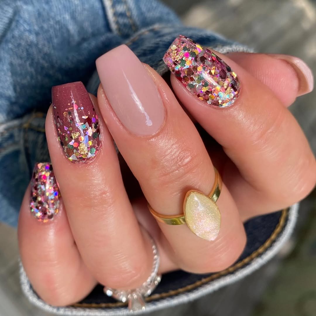 This one’s for the girlies who love sparkle but still want polish (pun intended). The soft nude center nail balances out the glitter party happening everywhere else, creating the perfect blend of subtle and extra.