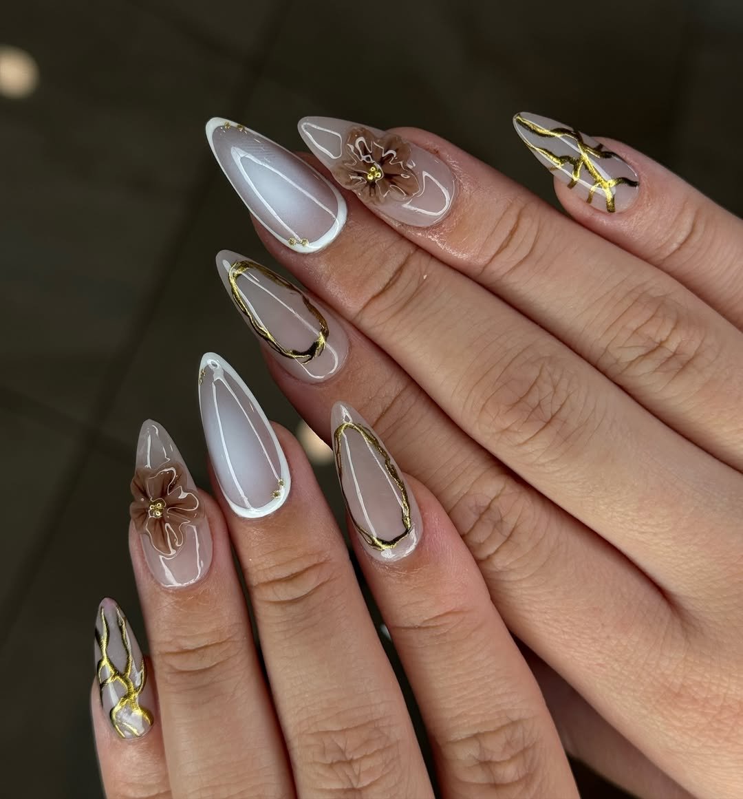 There’s something magical about how delicate and layered these are—crystal-clear bases with gold-lined edges, milky white tips, and literal 3D flowers? It’s giving enchanted forest meets fine jewelry.