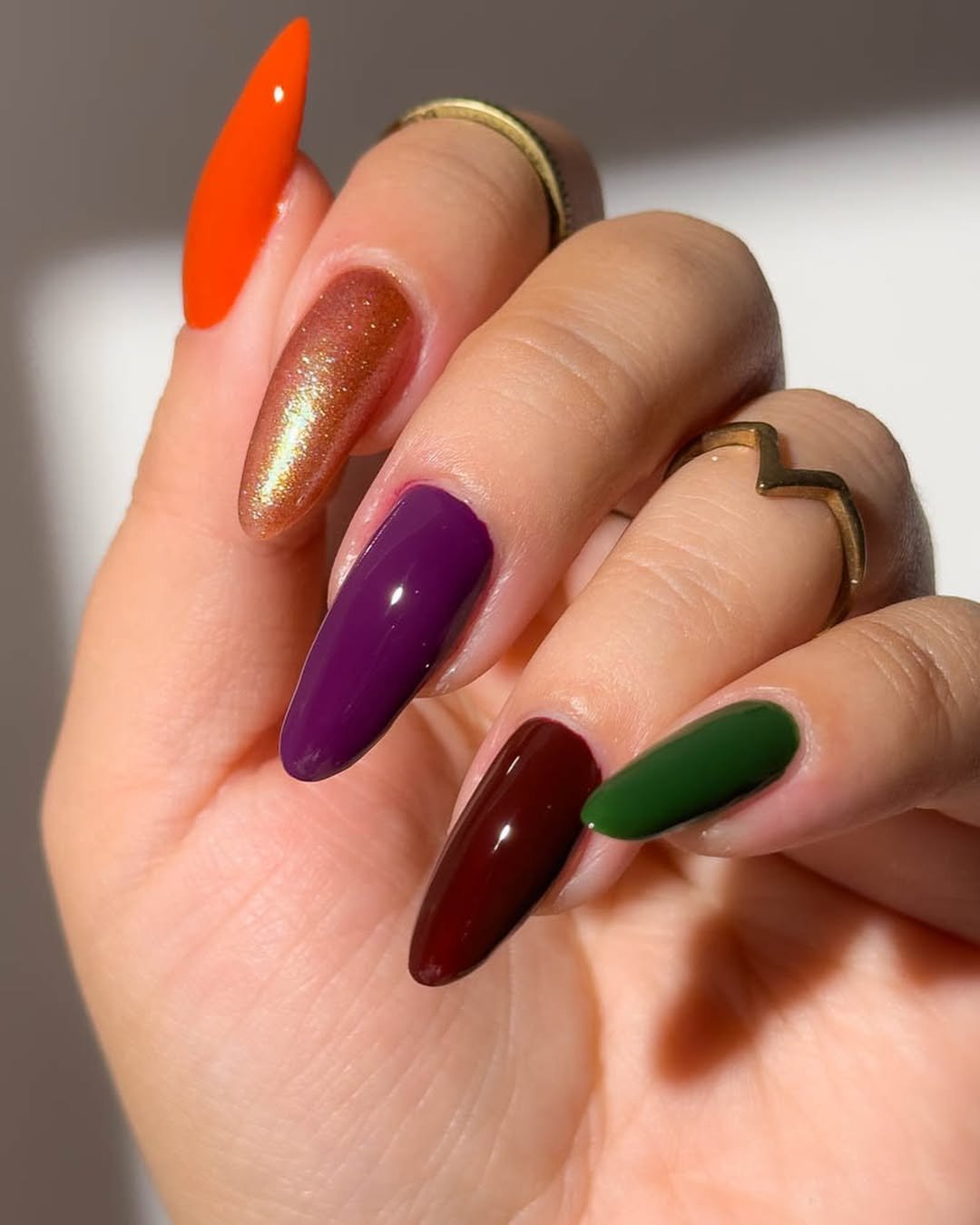 This is what happens when fall shades hit the dancefloor—every nail gets a solo. Rusty orange, shimmery bronze, vampy berry, forest green, and regal plum take turns showing off. No two nails are alike, but together? Total harmony.