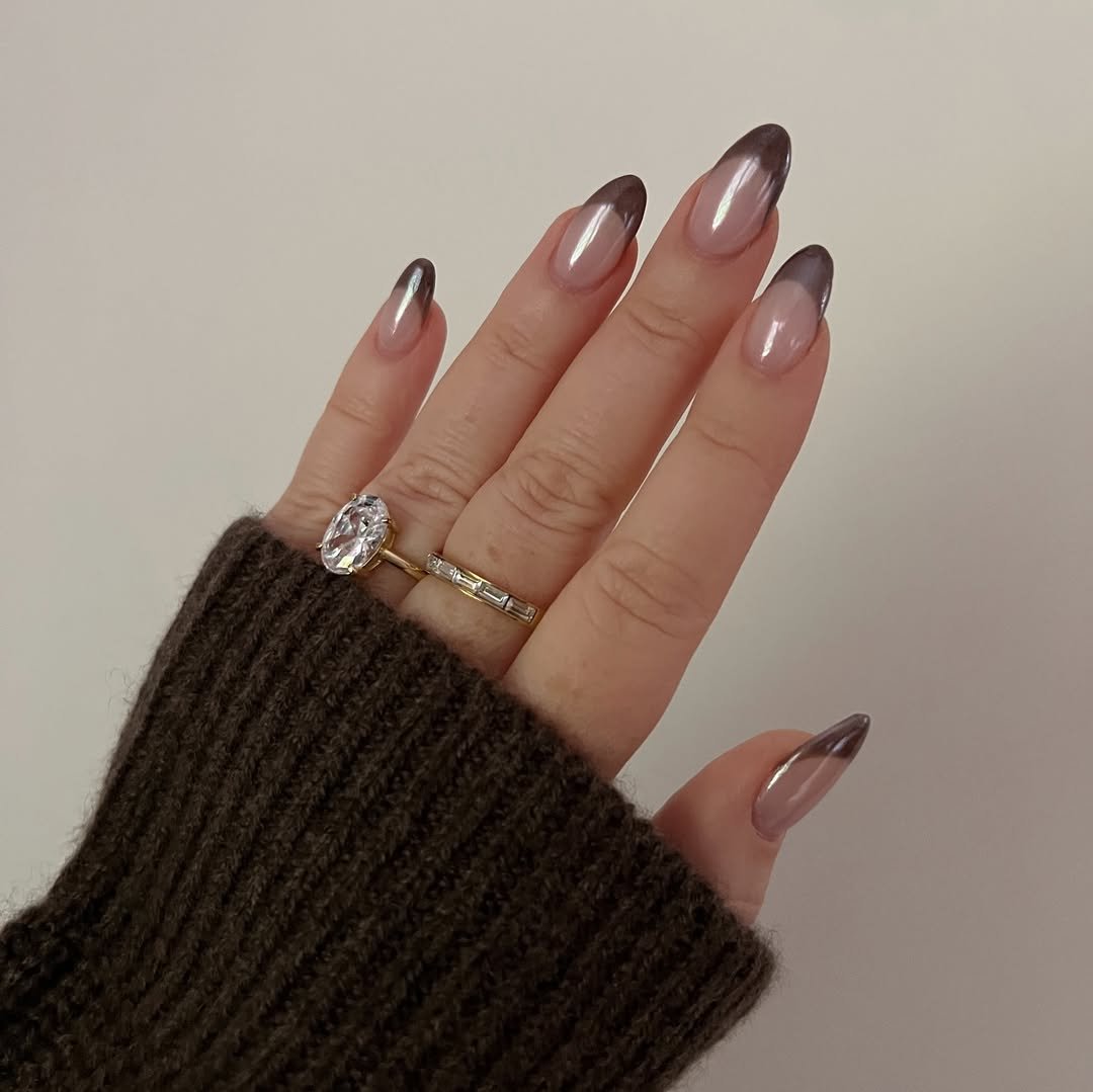These soft chrome tips feel like they were dipped in a mocha cloud. They’re almost bridal but then they shift into smoky taupe—like your neutral nail went to Paris and came back with a better wardrobe and a mysterious accent.