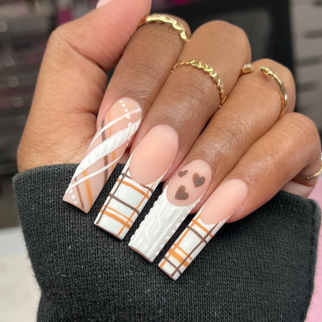 This set is basically the PSL of nail art—it’s cozy, creamy, and hits all the right fall notes. With those sweater-knit textures, cocoa plaid, and adorable chocolate hearts, it’s like your nails are wearing their own little cardigans. Every finger is a full vibe.