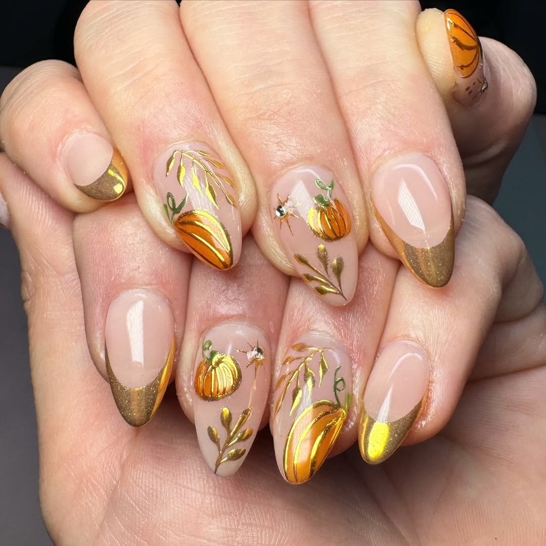 It’s a cozy PSL in manicure form, but with a high-gloss finish and real art-school energy. The pumpkin sketches aren’t cartoonish—they’re delicate, painterly, and outlined in gold like they belong in a Renaissance harvest mural.