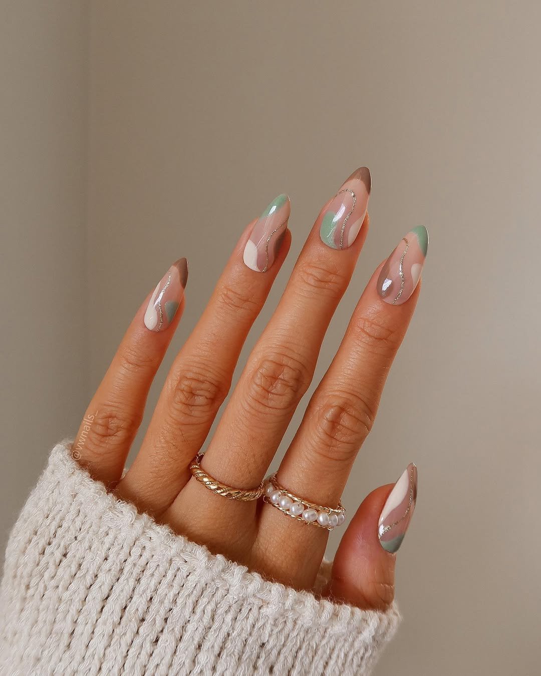 Muted mint, blush pink, and silky mocha come together in these dreamy swirl nails. There’s an elegance to the simplicity here—no single line is out of place, and the thin silver accents add just enough sparkle to catch the eye.