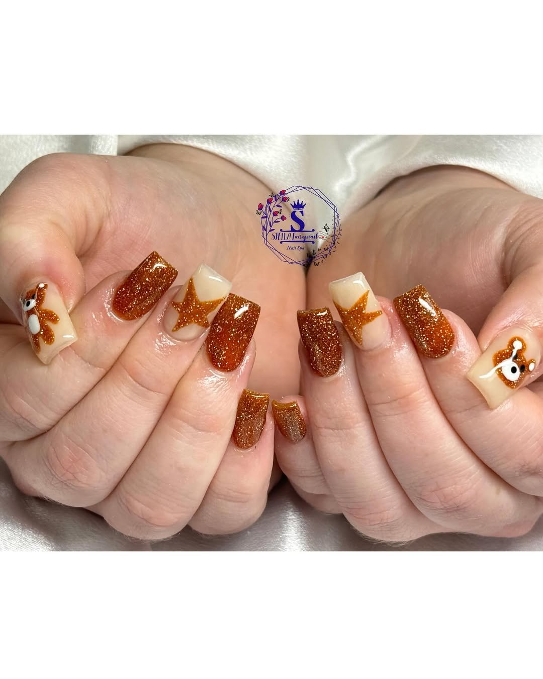 Whimsical meets bold with these burnt orange glitter tips, complete with the cutest sea creatures sprinkled across. The little bear and starfish motifs make it playful, while the full-glam sparkle keeps it extra.