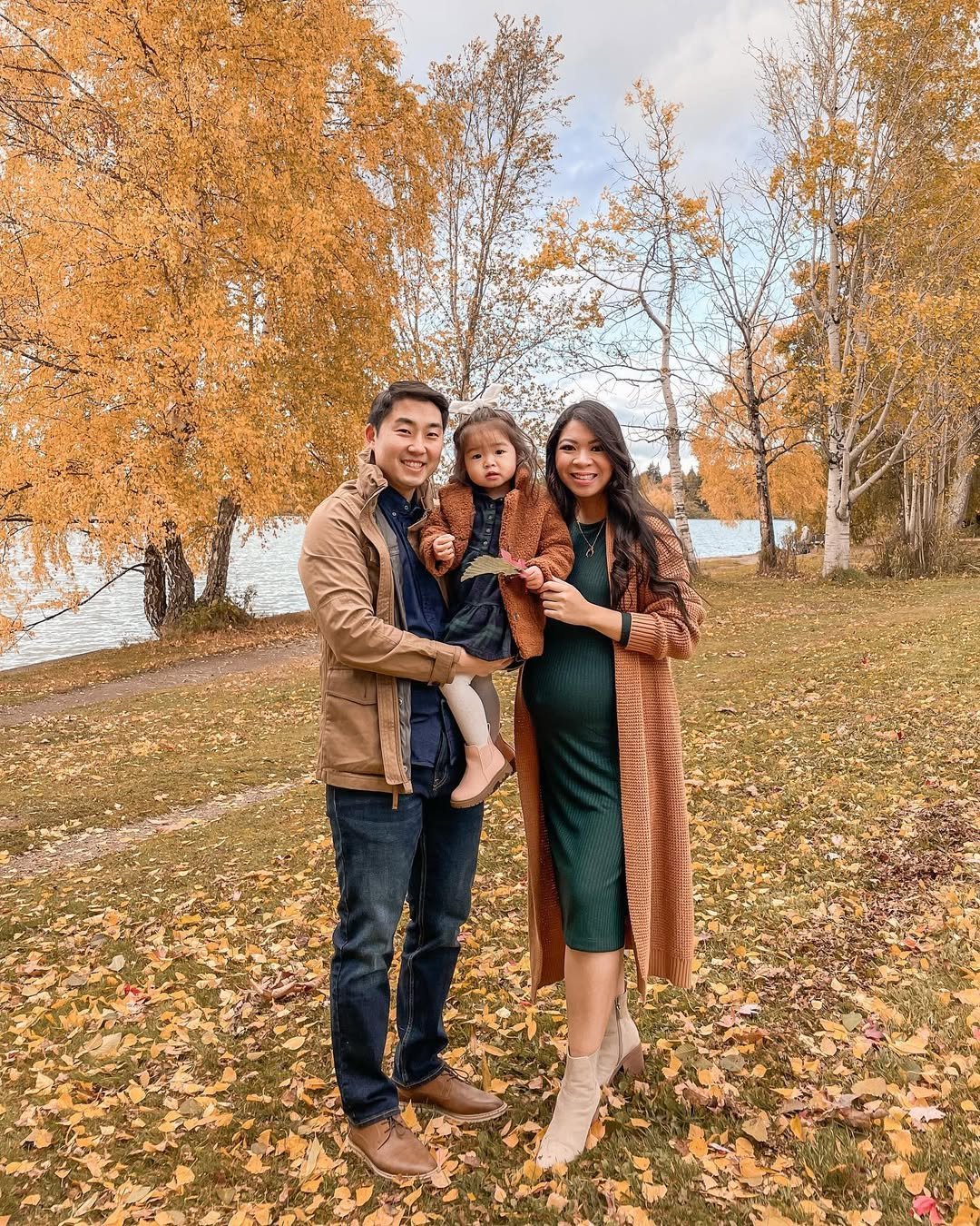 Earthy tones win every time in fall, and this combo proves it. A deep green dress for mom, warm caramel layers, denim, and neutral boots—simple pieces that photograph beautifully against golden leaves and water views. It’s balanced without trying too hard.