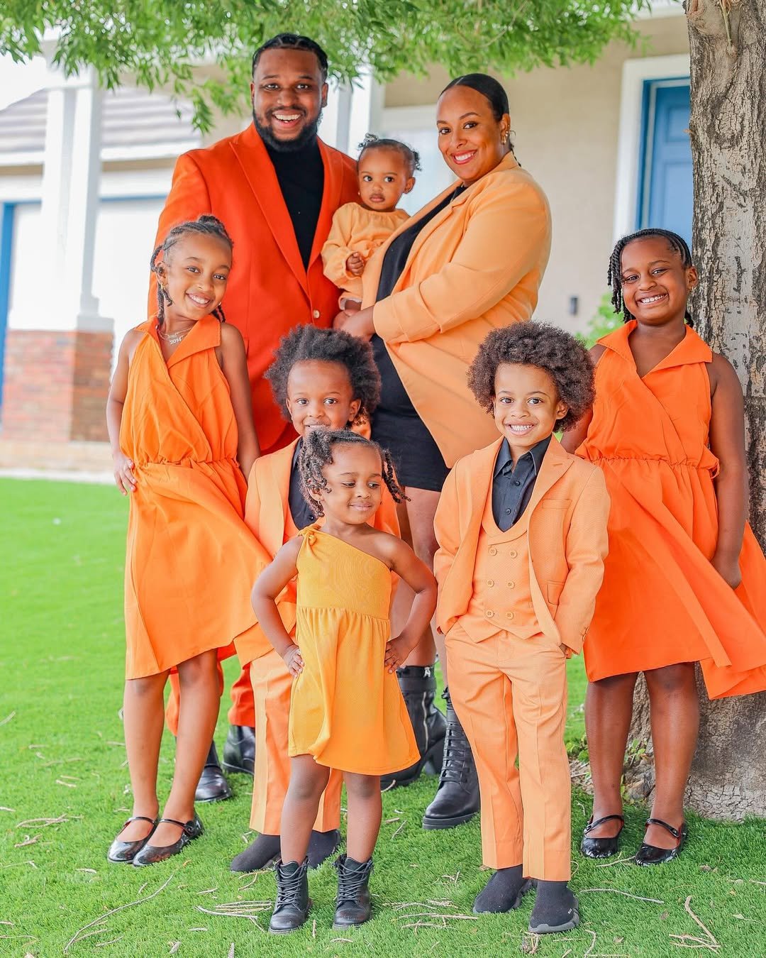 This one radiates joy. Saturated tangerine, warm marigold, and sharp black create a color story that feels fearless yet polished. The coordinated suiting moment between dad and son adds structure, while the girls’ flowing dresses soften the palette with movement and charm. It is playful, but it holds its shape.