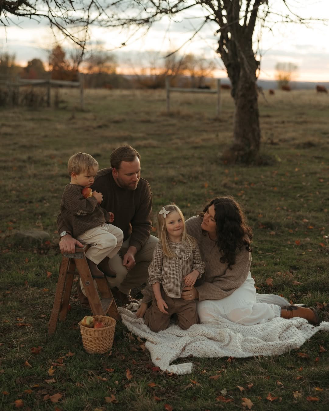 This is peak golden-hour magic. Cream knits, soft browns, and denim all layered together like a Pinterest board that actually came to life. The textures do all the talking—chunky sweaters, baby rompers, worn-in boots—while the warm autumn backdrop wraps everything in that glowy, nostalgic filter we all secretly want.
