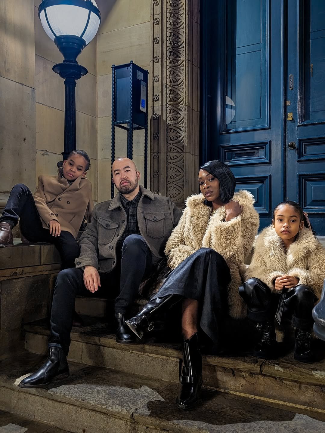 Moody lighting, structured coats, and sleek black boots turn this family portrait into something cinematic. The neutral and charcoal palette keeps it refined, while the faux fur textures add depth and drama. It is fashion-forward without losing connection.