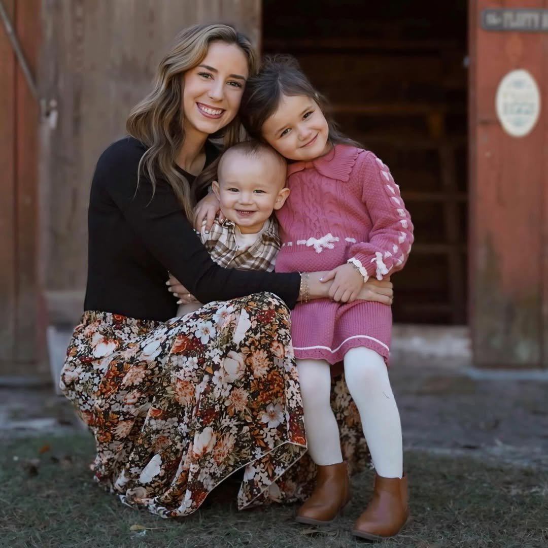 A black fitted top with a rich floral skirt? Yes, please. Add in a soft pink knit for the little one and suddenly you’ve got depth, texture, and just enough contrast to make the whole photo pop.