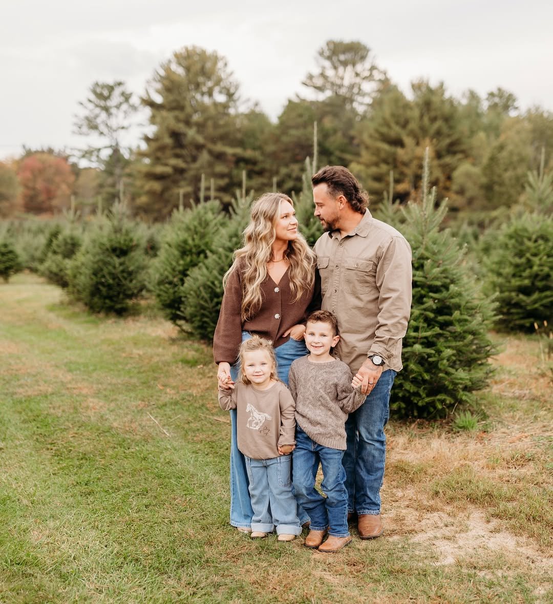 Soft browns, muted greens, and relaxed denim are basically made for a tree farm backdrop. The tones feel organic and grounded, blending seamlessly with the landscape.