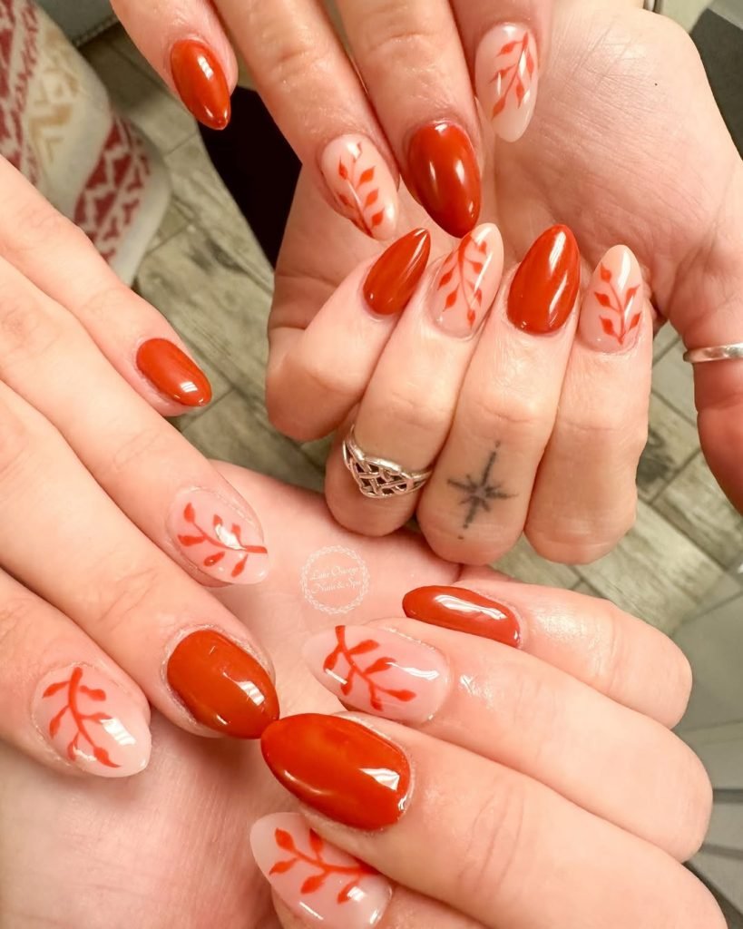 If you’ve ever wondered what PSL season would look like on nails, this is it. Burnt orange meets milky sheer with leafy minimalist accents in a style that’s so “hello fall,” but make it latte-art chic. The perfect balance of bold and subtle.