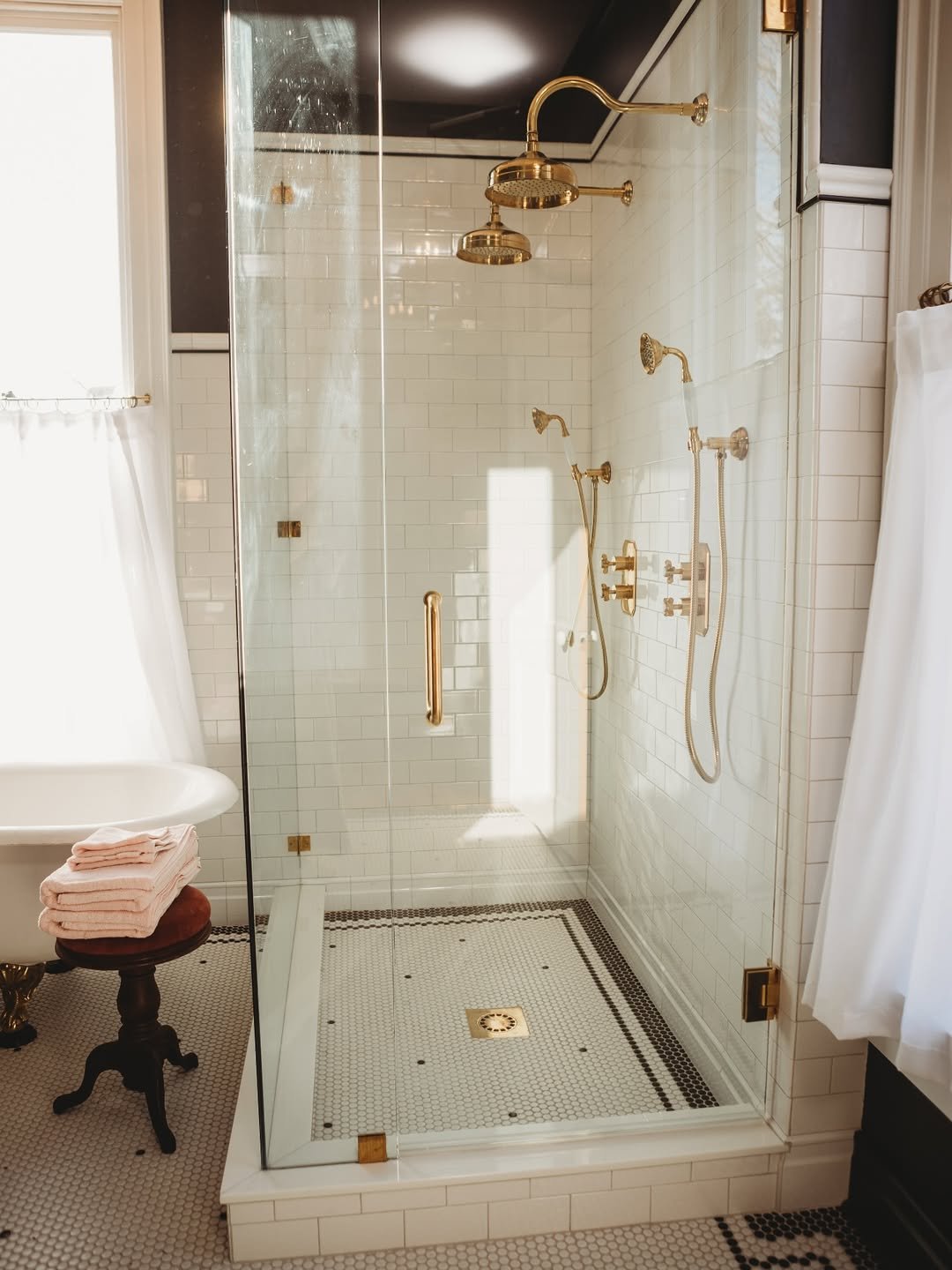 This one leans a little more polished, but still holds onto that farmhouse soul. The warm brass fixtures against the white tile feel elevated without being too fancy.