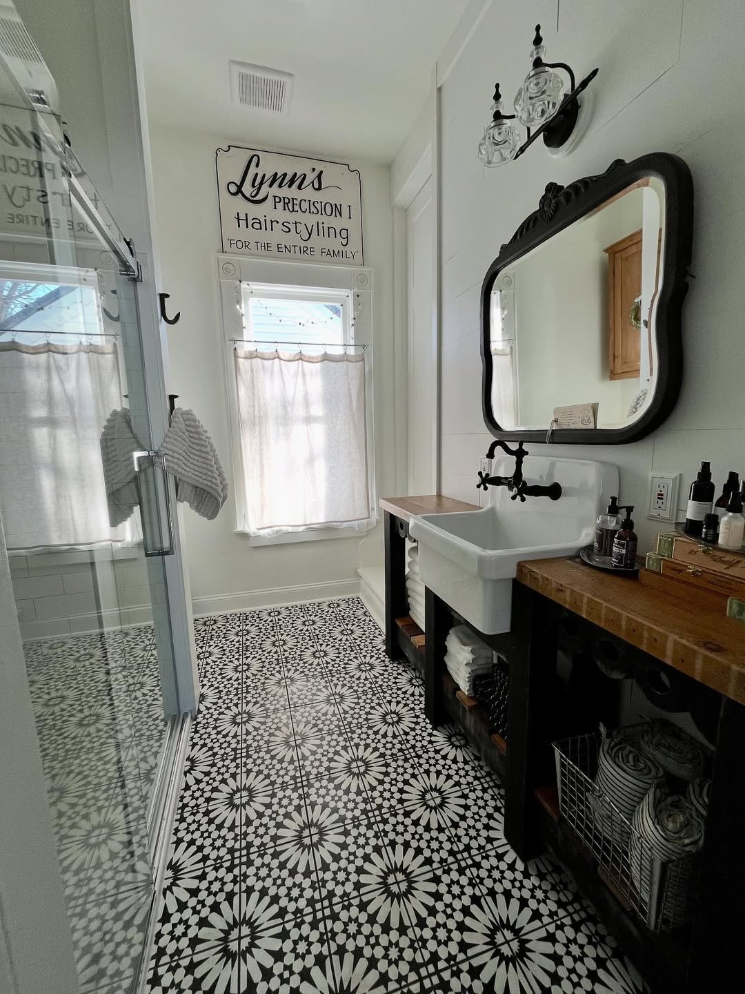 This one instantly pulls you in with that patterned floor—it’s giving old farmhouse character in the best way. Paired with crisp subway tiles and warm brass accents, it feels like a perfect mix of clean and collected.