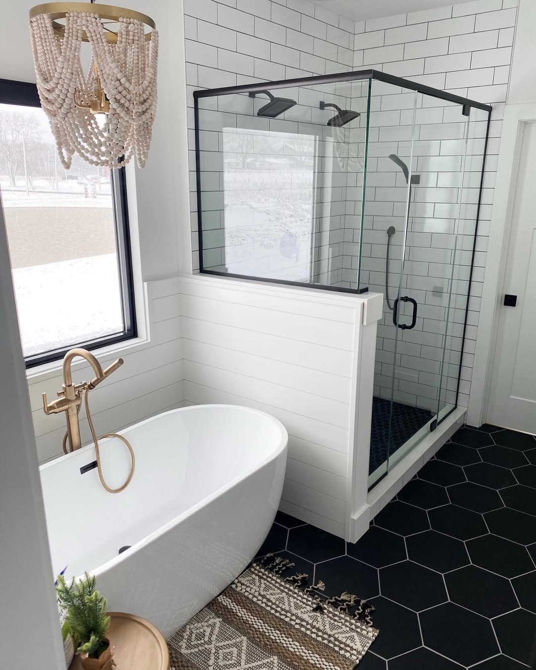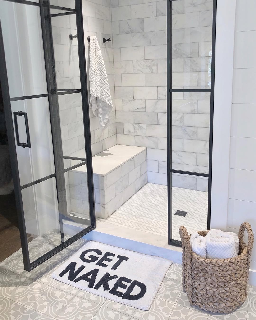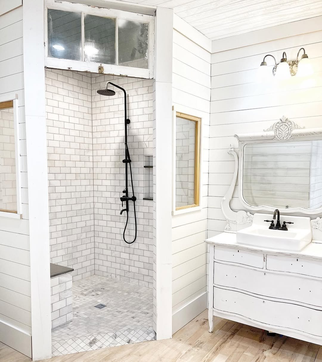 That marble shower setup instantly makes the space feel elevated, but the black grid framing keeps it grounded in farmhouse style.