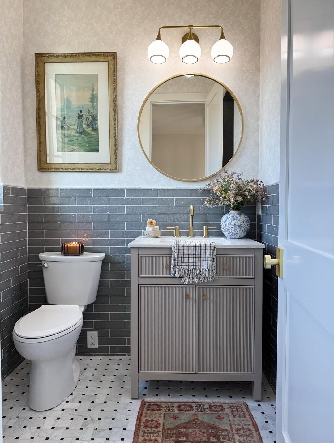 This one feels a bit more elevated. The grey tile paired with delicate wallpaper adds a soft, almost vintage elegance to the space.