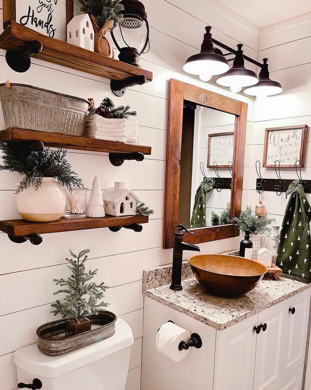 There’s something so charming about those vessel sinks. The aged finish brings in that vintage farmhouse feel without going overboard.