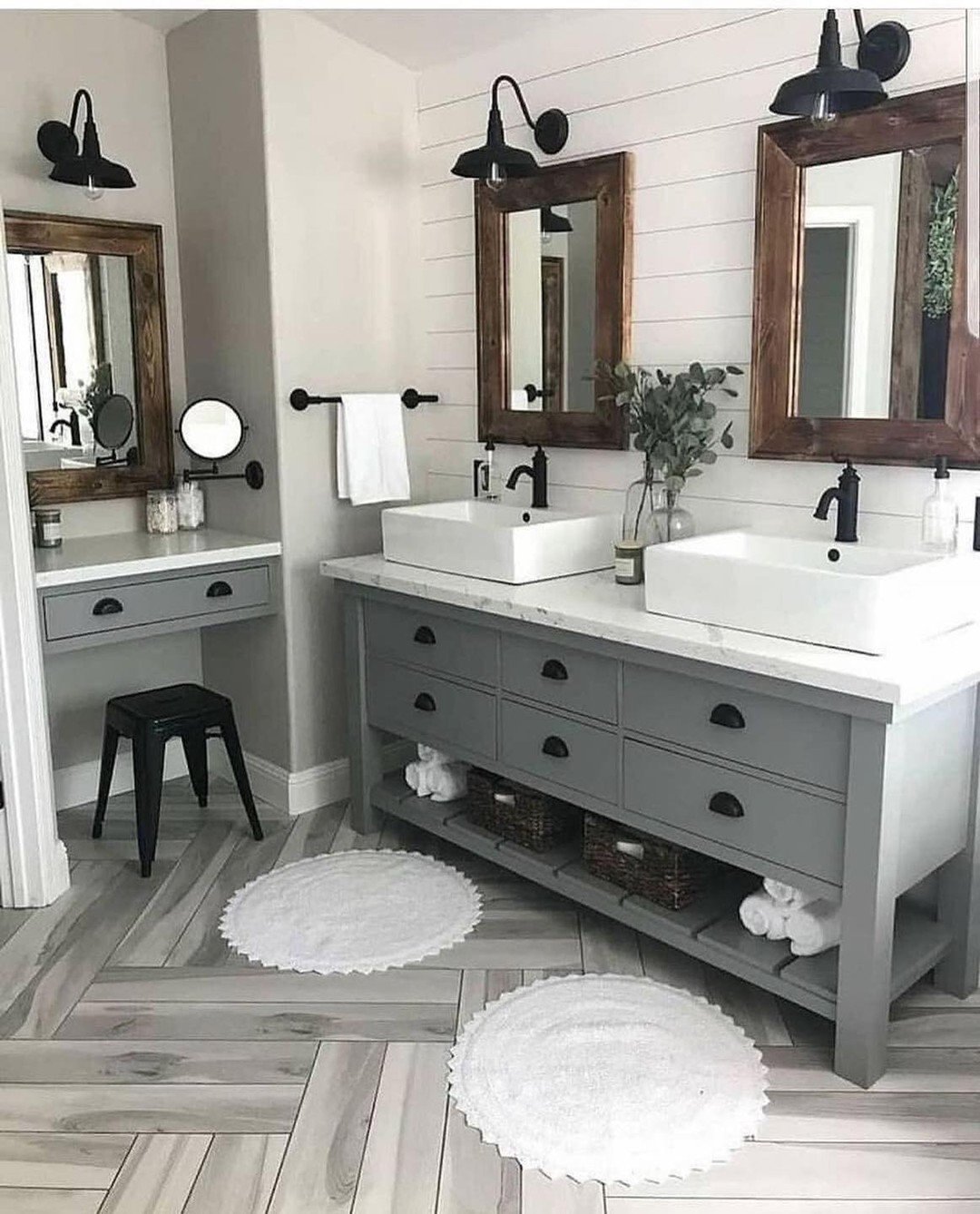 This one feels calm in the best way. The muted gray vanity keeps everything grounded while the white sinks and walls keep it light and fresh.