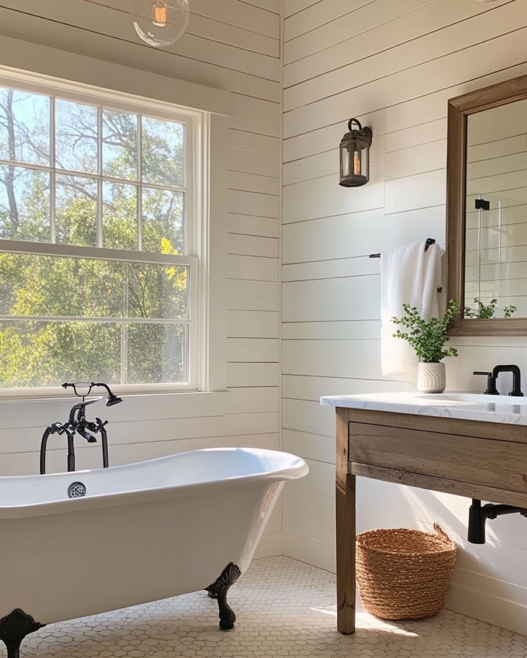 And that little bath tray setup? It’s giving “stay a little longer.” Exactly the kind of farmhouse vibe you want.