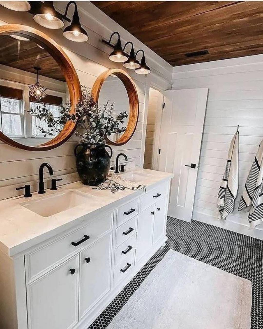 And those round mirrors with black fixtures? Such a smart contrast. It’s giving cozy farmhouse… but with just enough polish to feel put-together without trying too hard.
