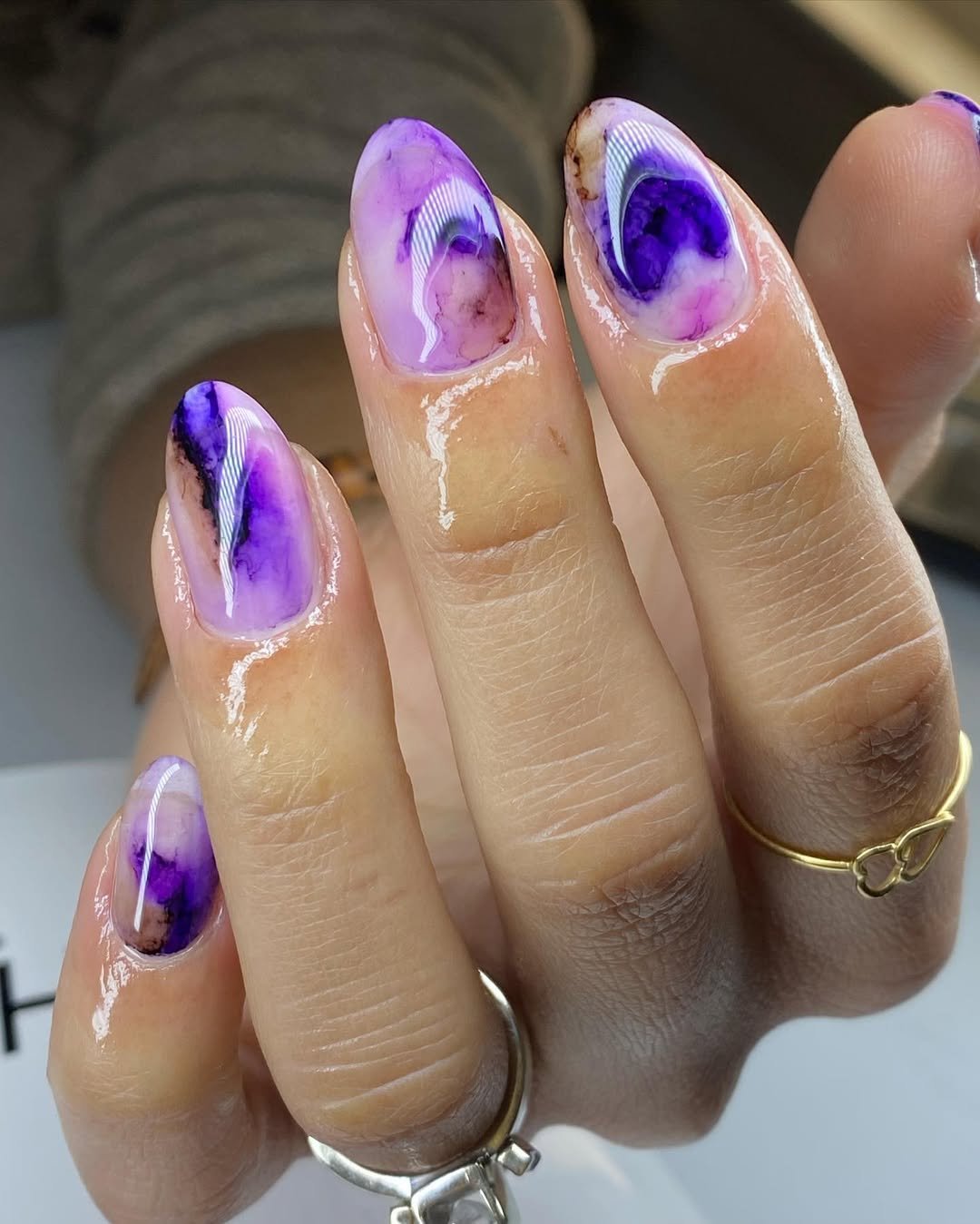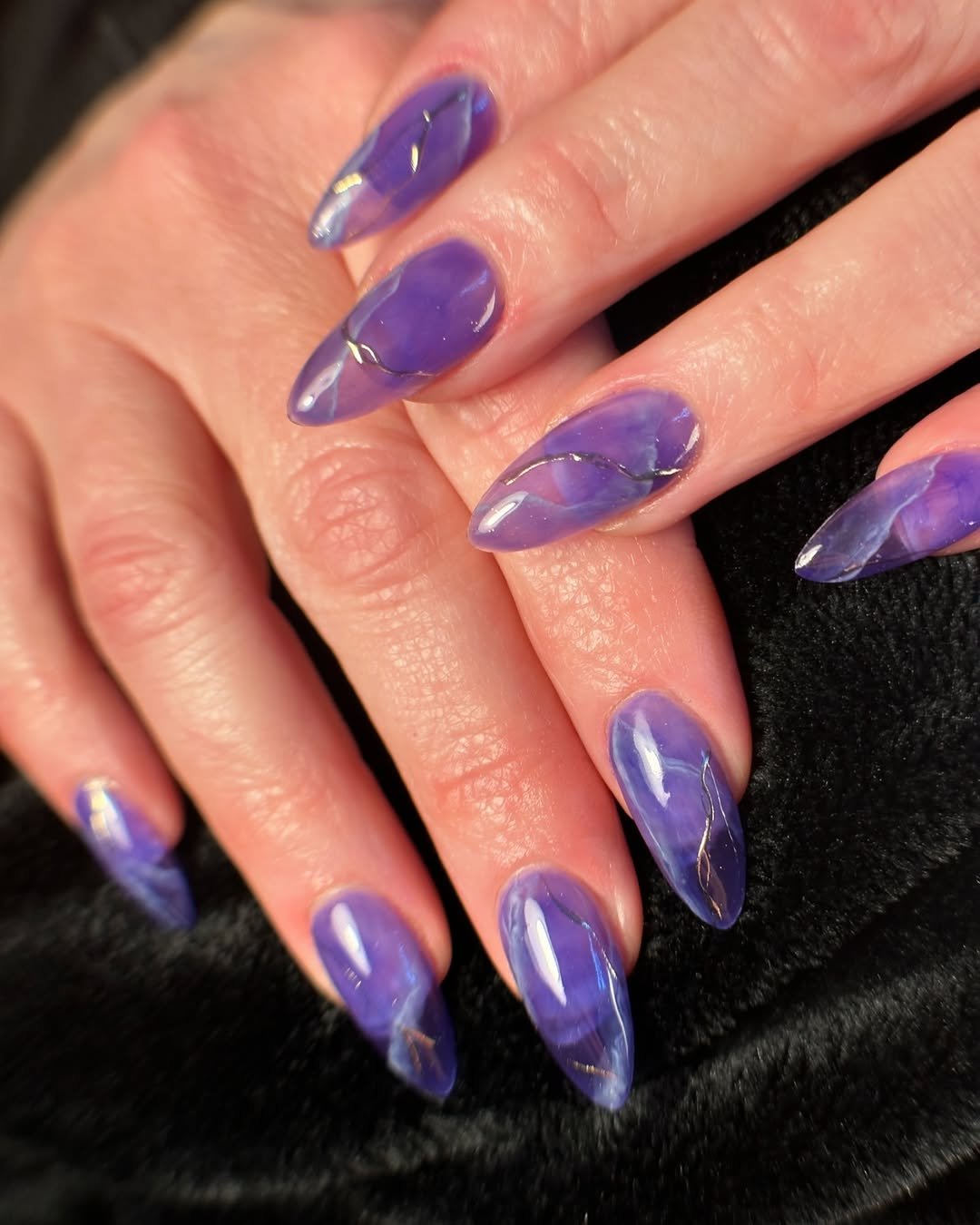 Deep violet blended with pale lilac marbling, gold streaks, and glossy shine—this set feels like a February night sky with extra glamour poured on top.