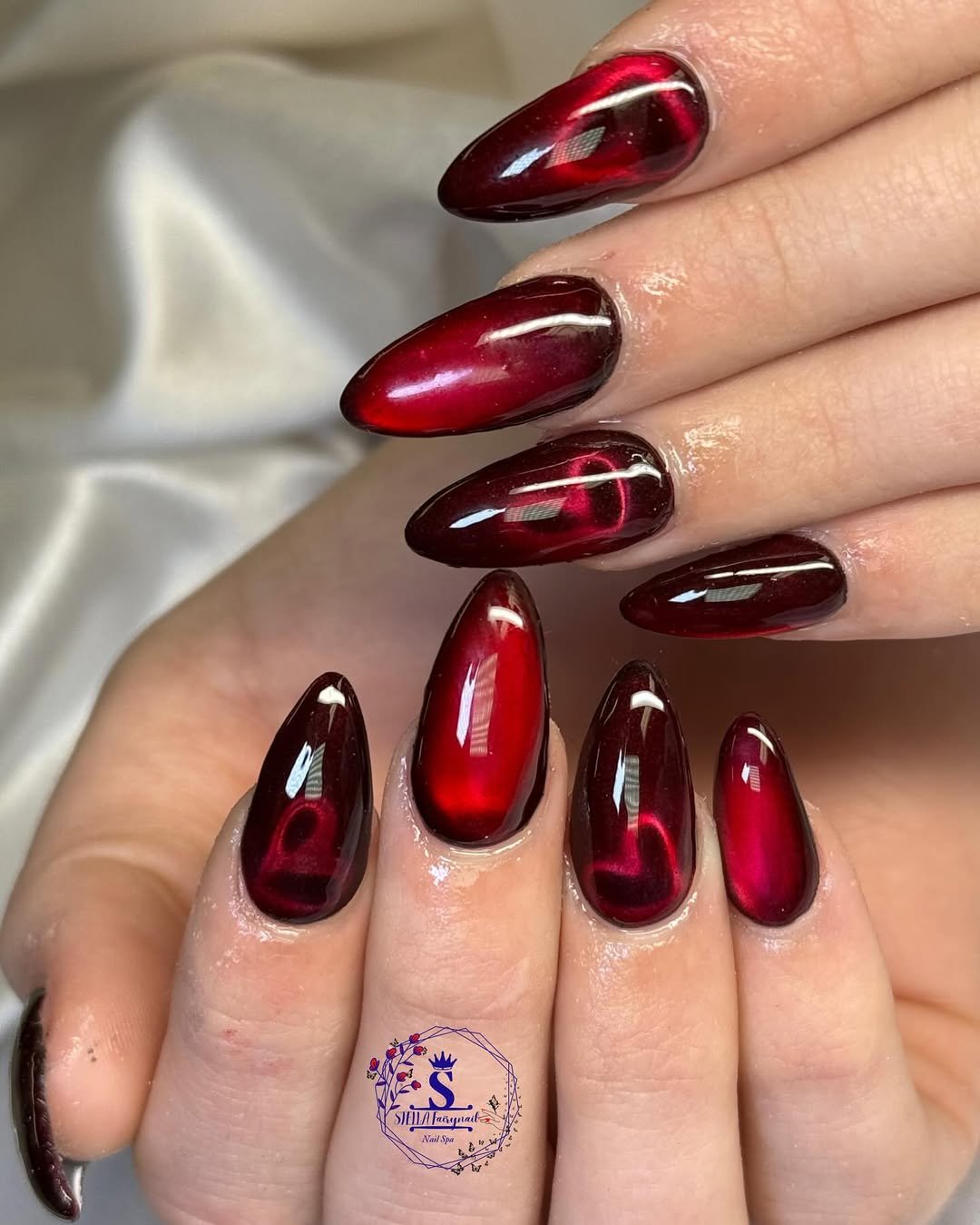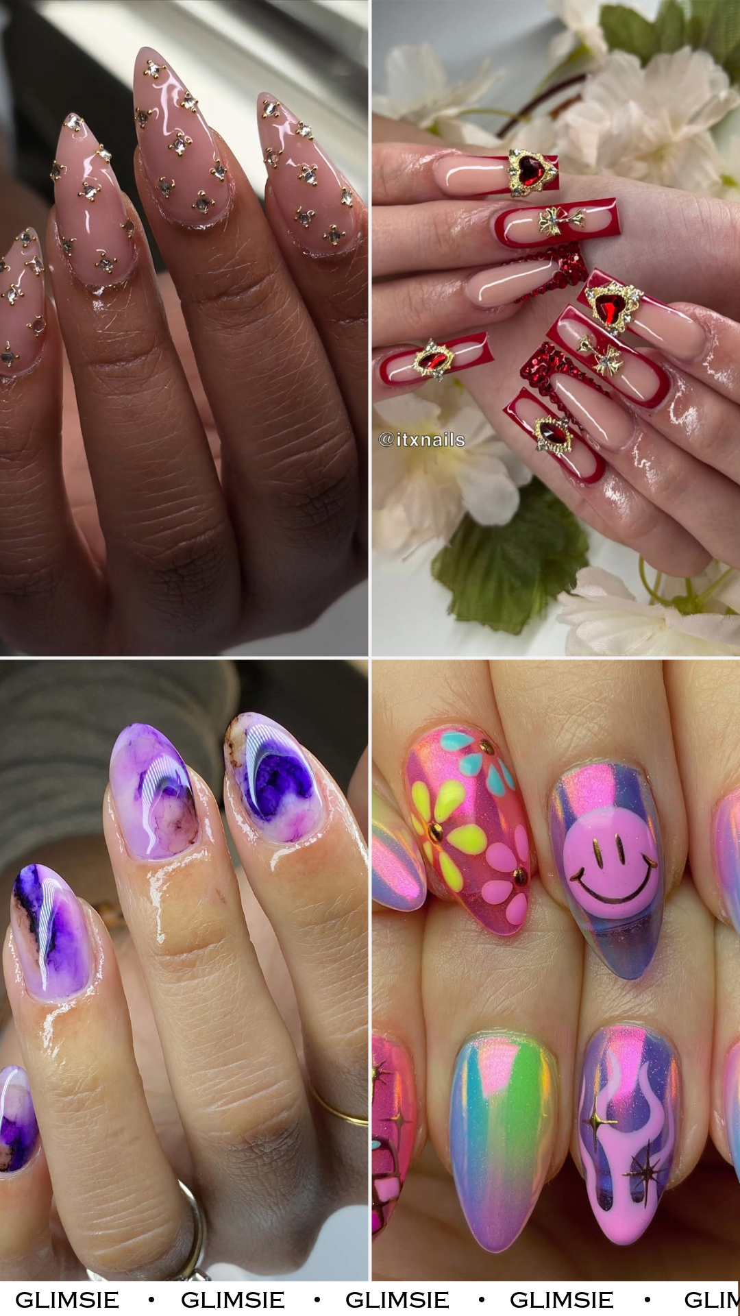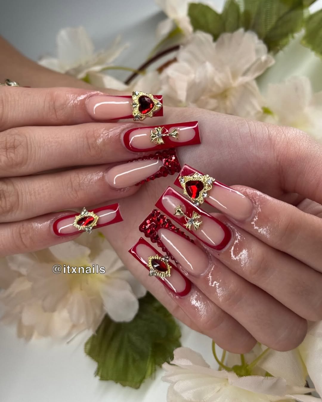 Bold red framing, gems, gold accents, and dramatic shaping—these nails feel like royalty. They’re unapologetically glamorous, a little dramatic, and proud of it.