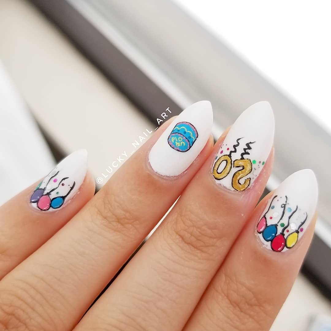 White nails with fun, quirky little birthday illustrations—balloons, cake, numbers—it’s like a mini celebration on each nail.