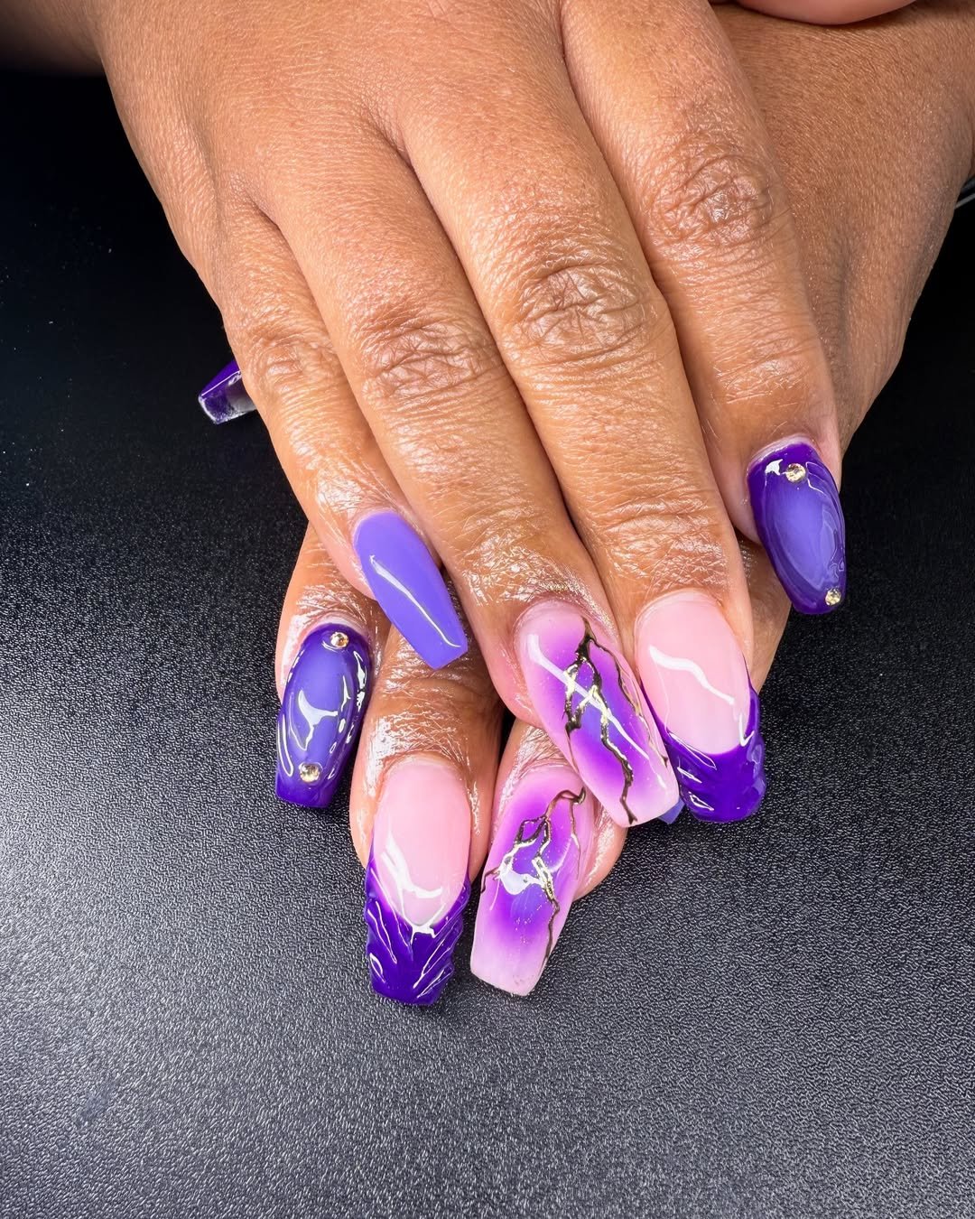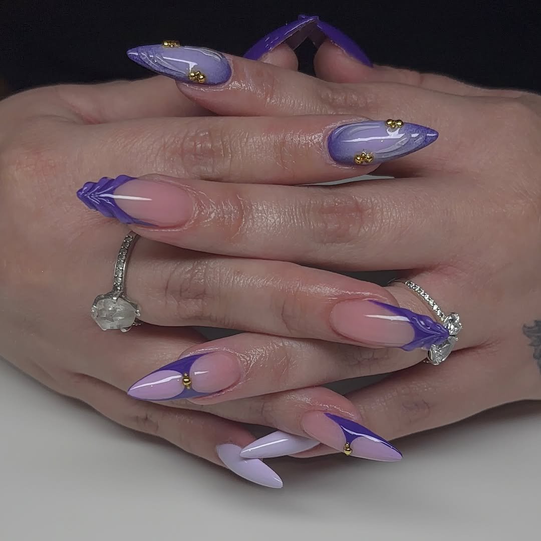 This purple-toned flame manicure feels modern and moody, with its soft swirls and sharp electric edges. Tiny gold studs add that finishing touch of polish.