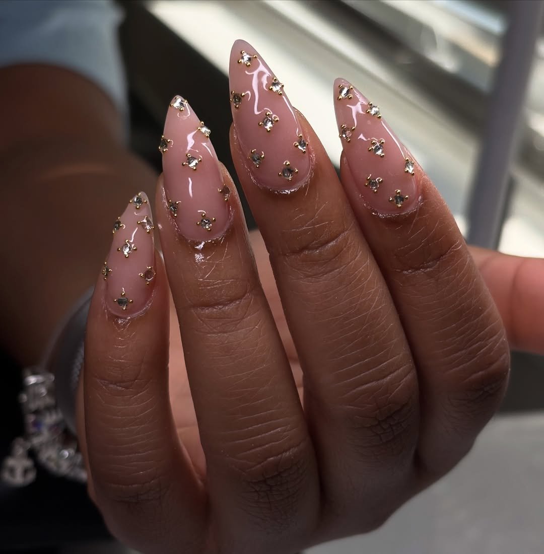 Clean, glossy nude nails covered in tiny gold accents—simple, but seriously impactful. This set whispers luxury without ever raising its voice.