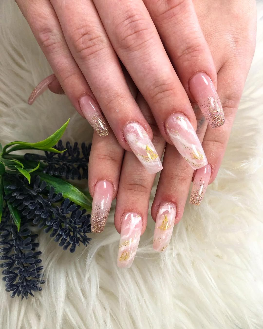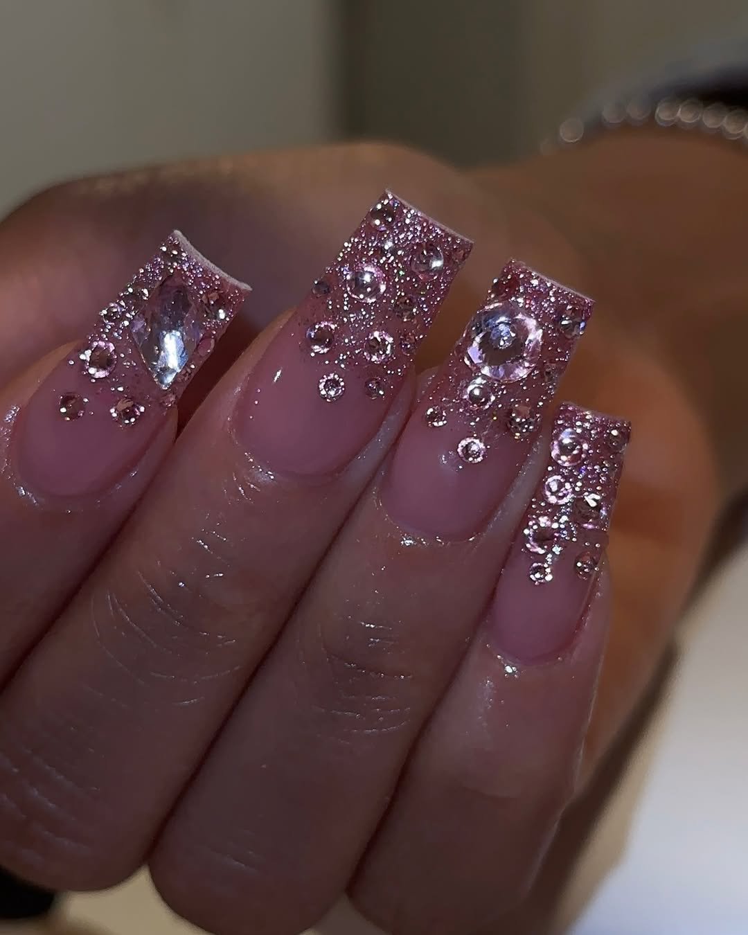 These glitter-drenched pink nails look like they were dipped straight into a birthday wish. The rhinestones, shimmer, and soft blush base create a vibe that’s festive but still wearable.