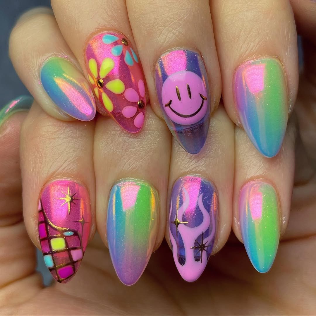 This set is pure joy—bright colors, playful designs, and that irresistible disco-shine finish. Each nail has its own little personality, making the whole look feel like a mini festival on your fingertips.