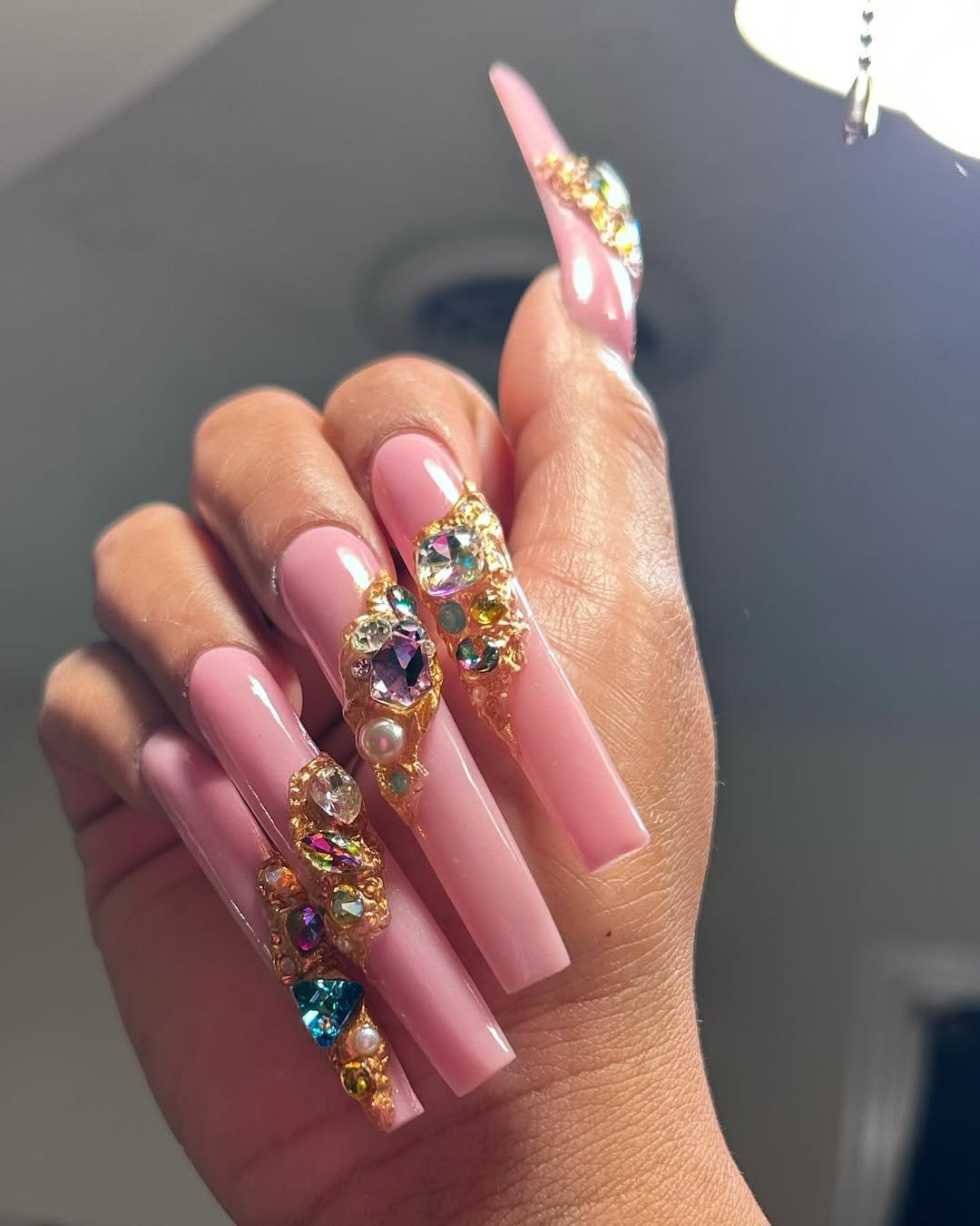 These long, shimmering crystal-studded nails are basically disco lights in manicure form. Pink, sparkly, extra—what more could a birthday queen want?