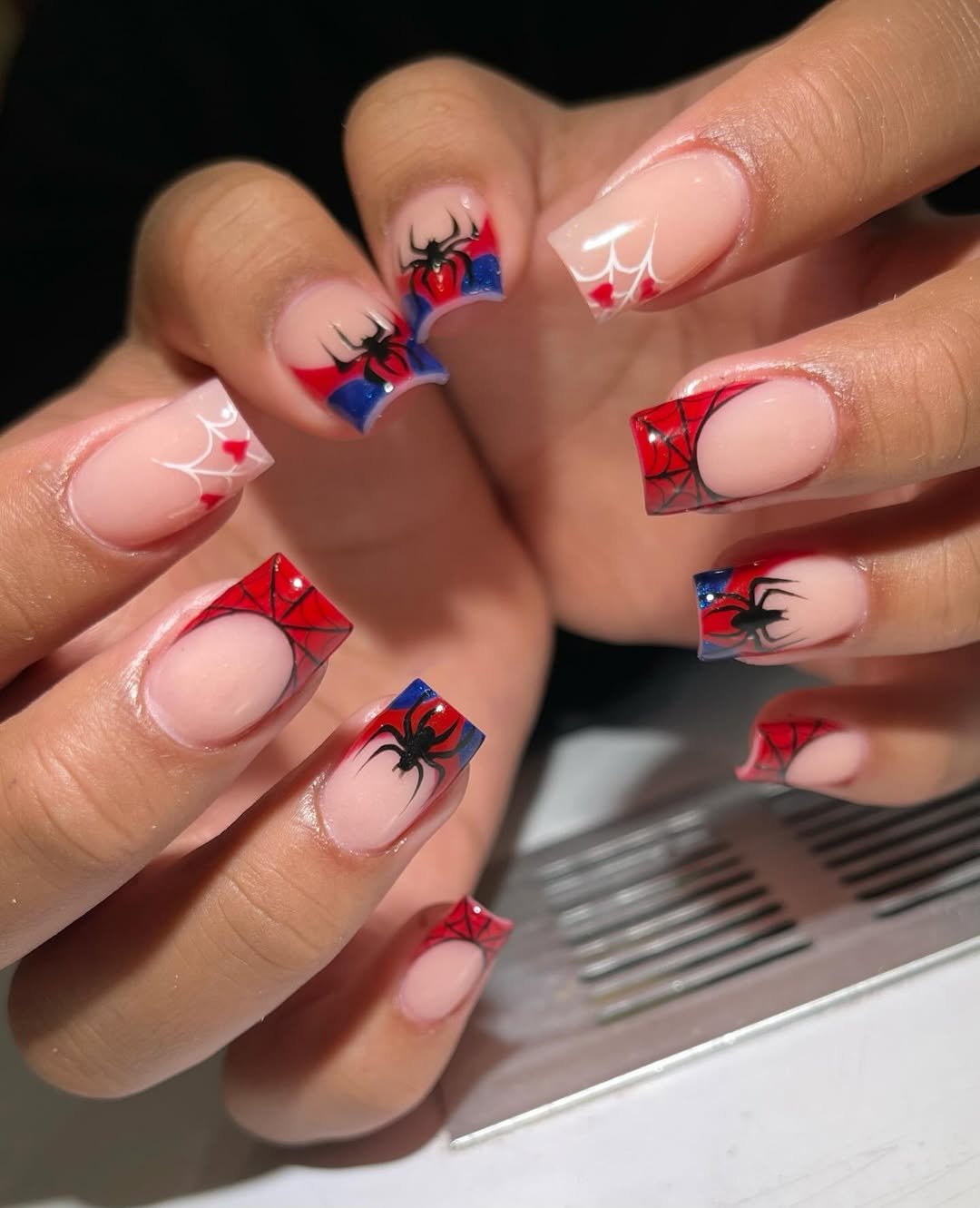February babies who love a theme—here’s your moment. Bold red-and-blue French tips with hand-painted spider webs and mini spiders? It’s playful, unexpected, and way cooler than the average birthday mani.
