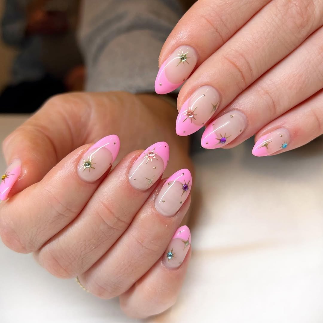 These bright pink French tips with tiny celestial accents feel playful in that “I still make wishes on shooting stars” kind of way. Each starburst charm catches the light just enough to make the whole set feel alive.