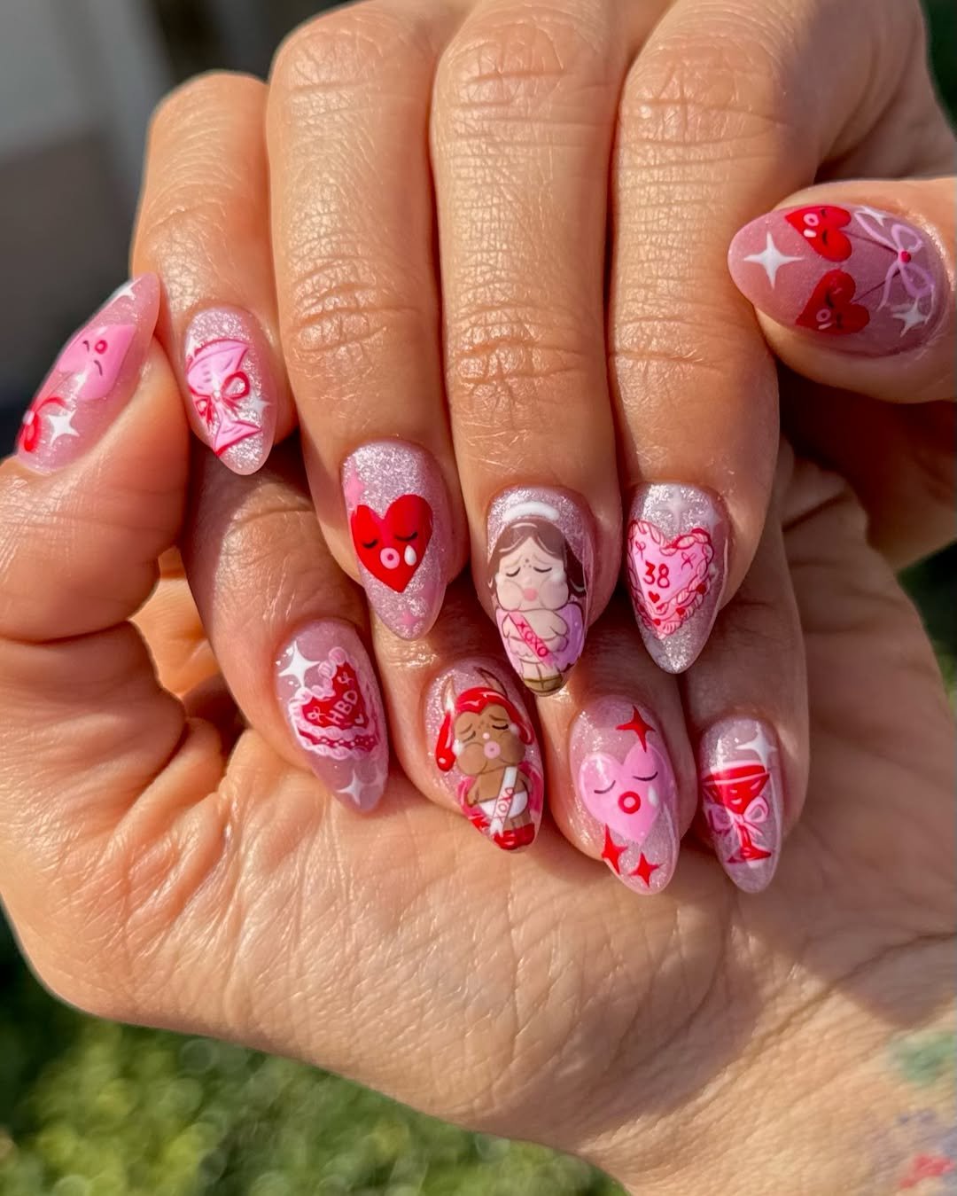 These nails are giving full-on February birthday energy—cute, sparkly, and just a little chaotic in the best way. The mix of hearts, characters, and pink shimmer feels like a party on every fingertip. It’s the kind of set that basically sings “I want cake and attention.”