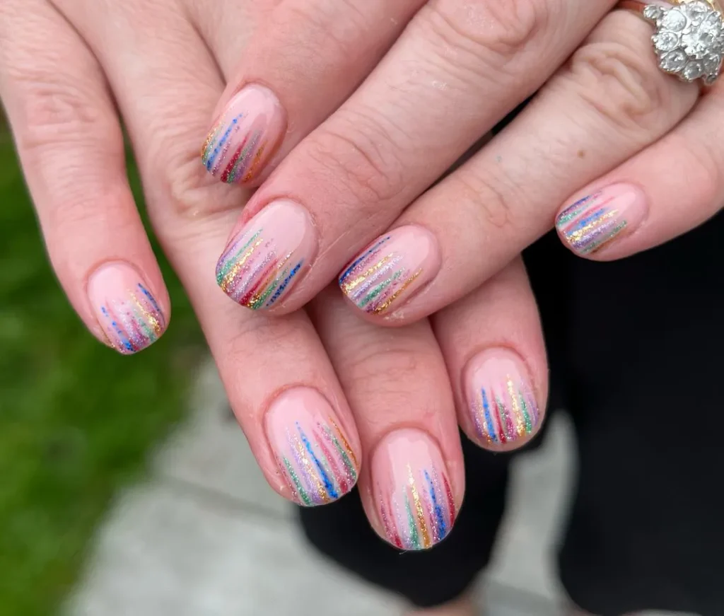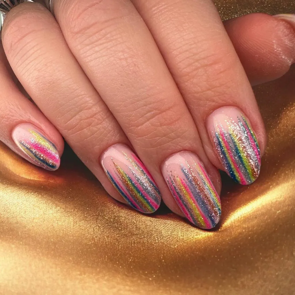 This one is playful in the prettiest way. The sheer pink base with rainbow streaks feels like fireworks seen through a dreamy filter—light, happy, and surprisingly wearable.