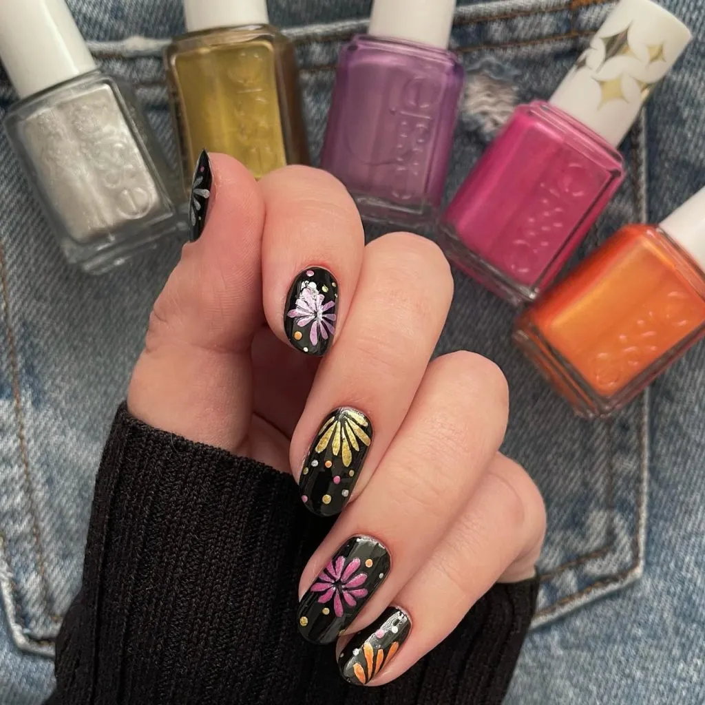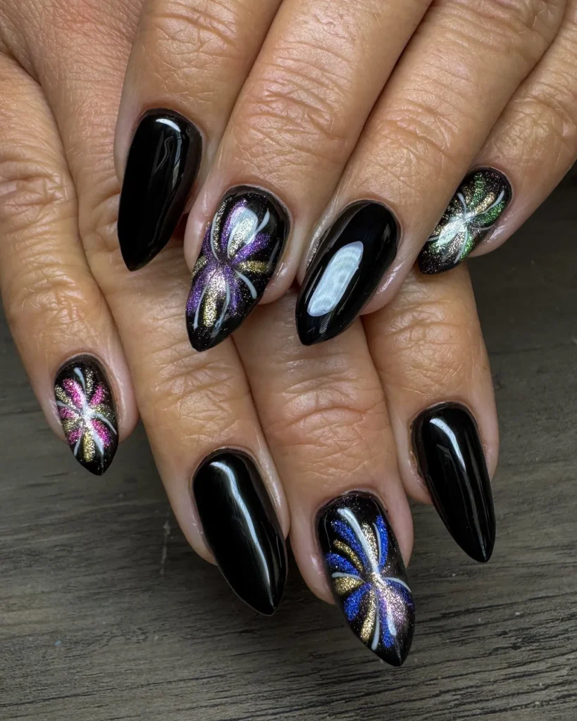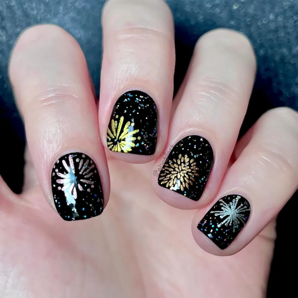 Black polish always makes fireworks hit harder, and this look proves why. The gold and silver bursts feel crisp and intentional, like watching a perfectly timed show against a clear night sky.