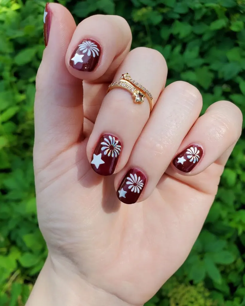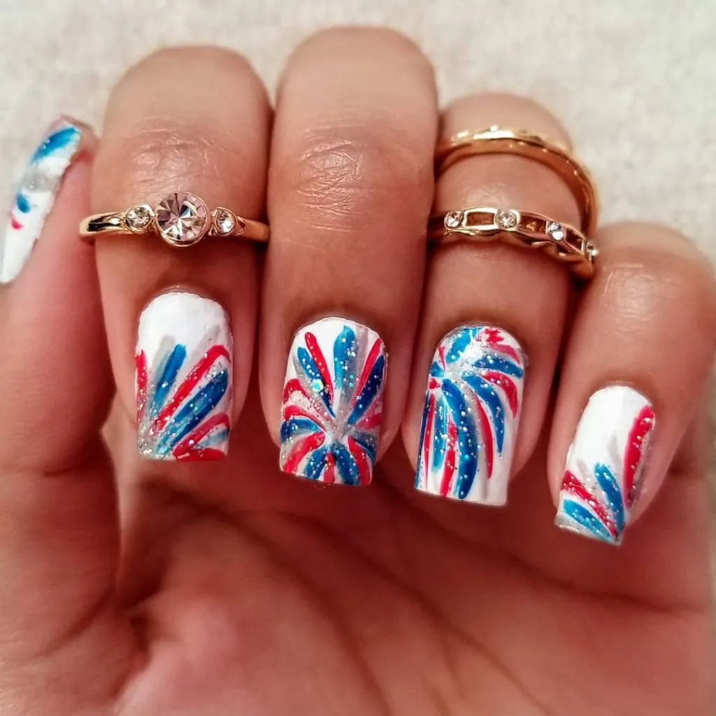 These are full-on celebration nails. The crisp white base lets the red and blue firework swirls pop, giving major festive energy without feeling messy.