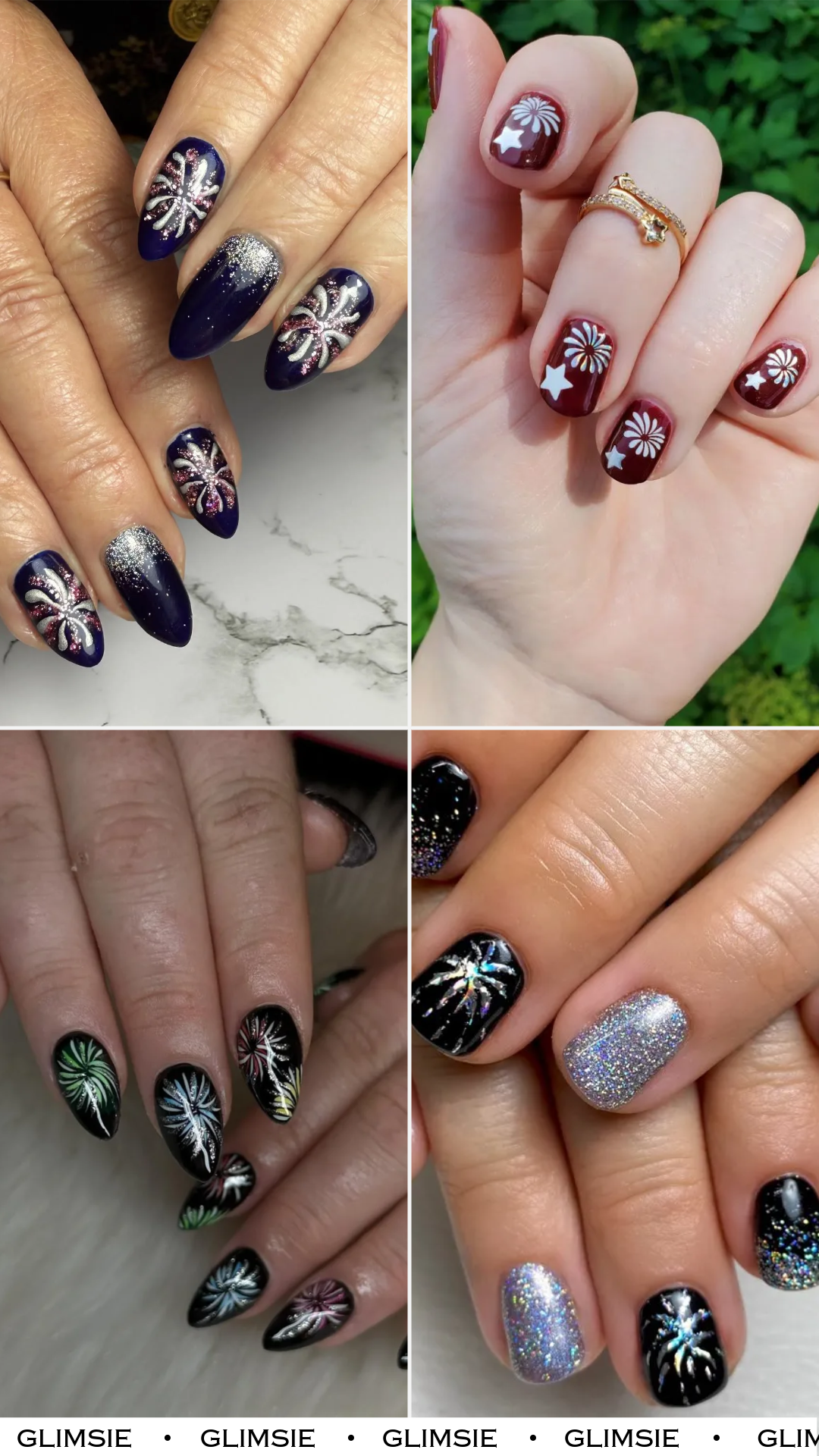 In this list, you’ll find inspiration ranging from subtle shimmer details to full-on statement sets that glow under lights and cameras alike. Get ready to explore firework-inspired nail ideas that make every celebration feel a little more magical.