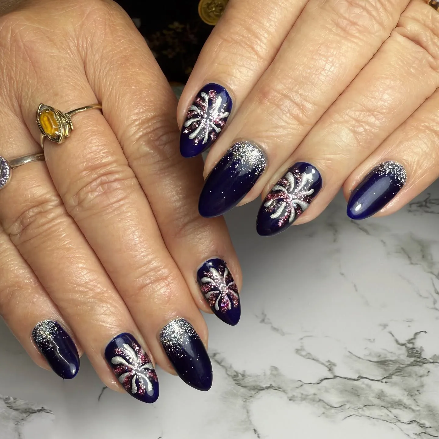 These nails look like fireworks frozen mid-explosion. The rich navy base makes the silver and pink bursts feel extra dramatic, almost like looking up at the night sky just as everything lights up.