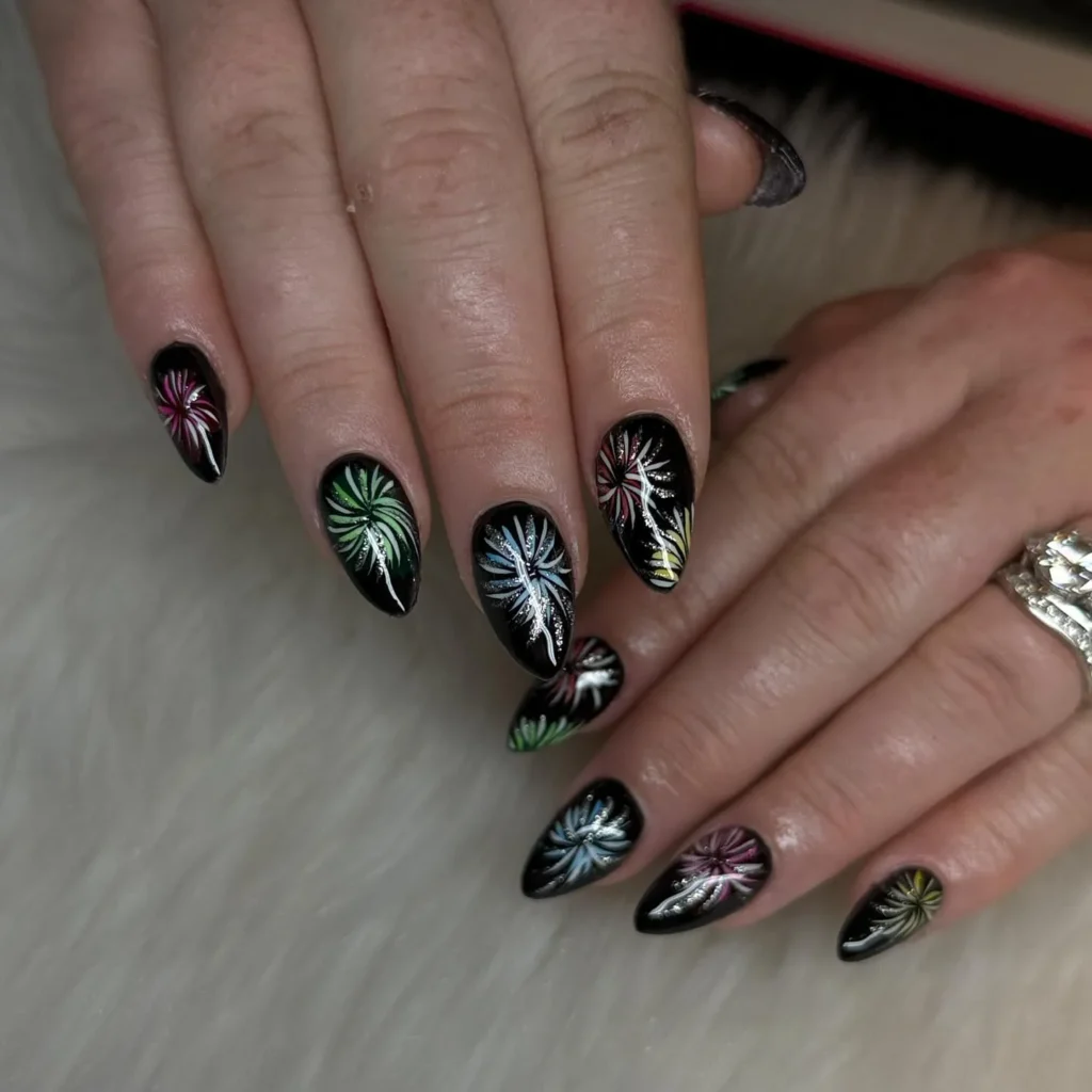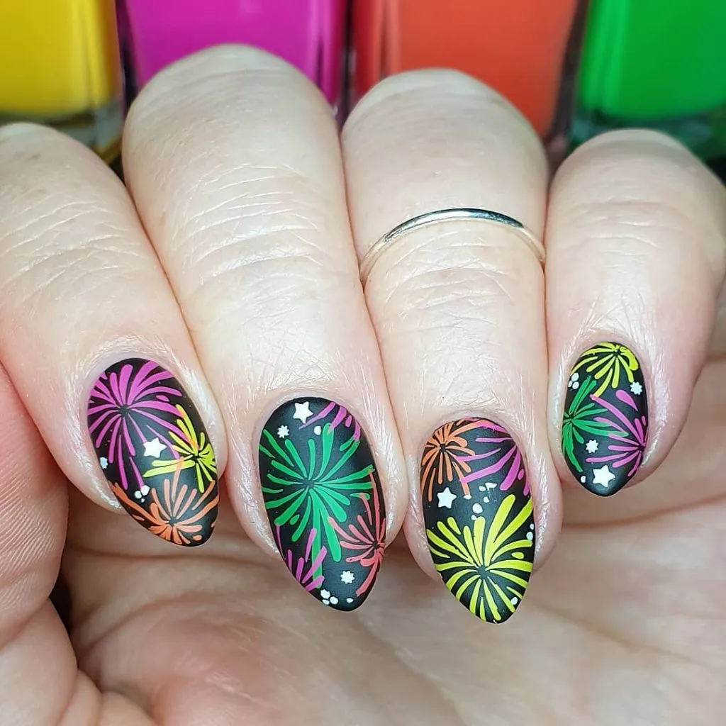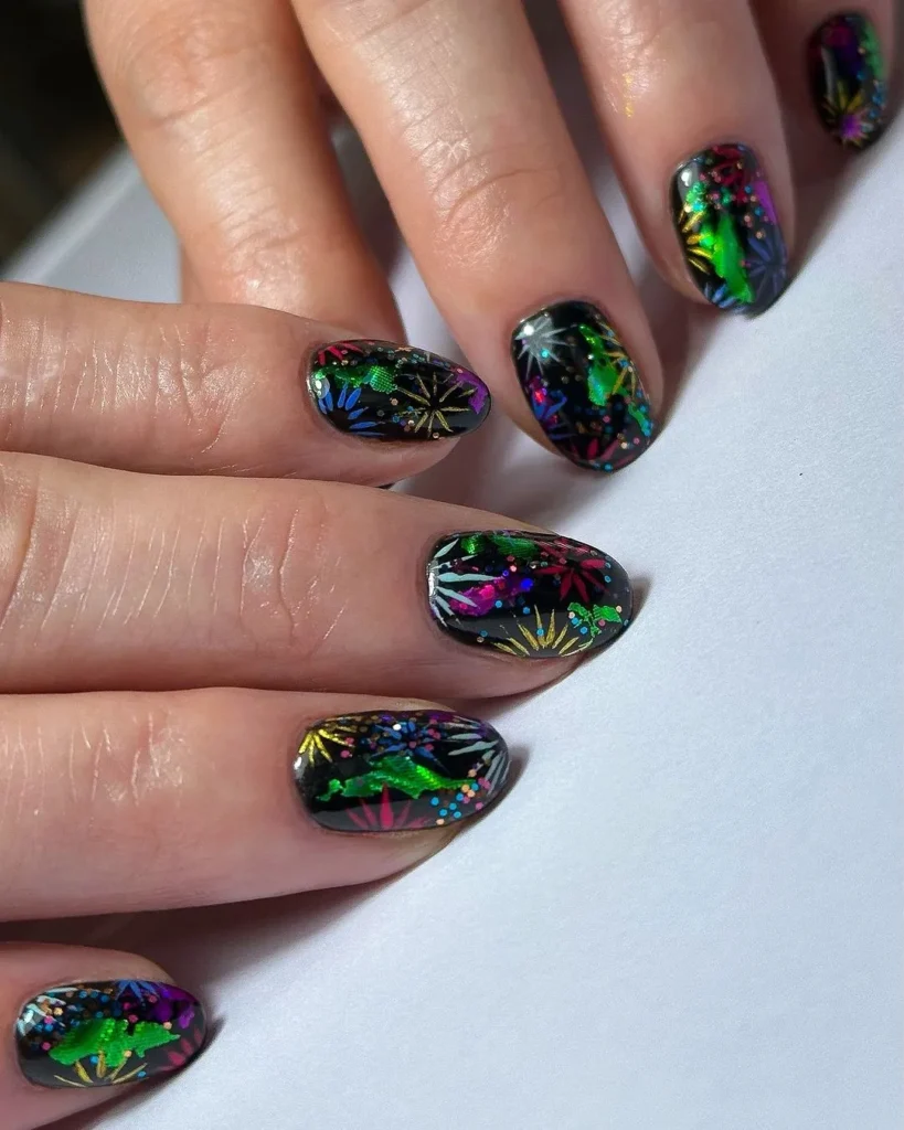 Proof that you don’t need long nails for impact. These compact fireworks pop beautifully against the dark base, making every nail feel intentional.