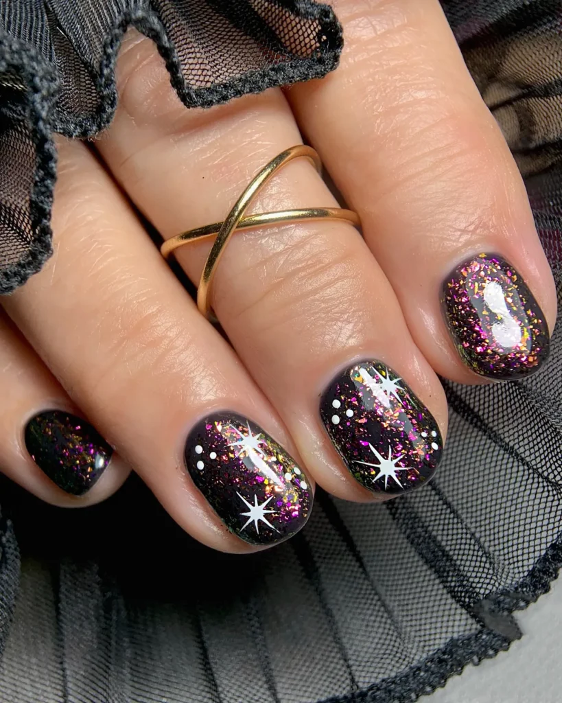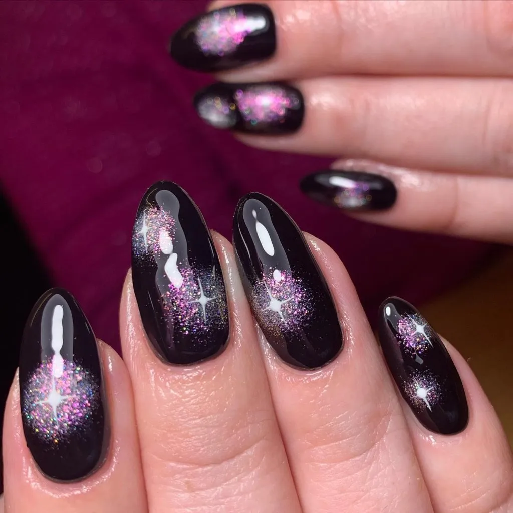 These look like fireworks floating through space—dark, glossy nails with concentrated sparkles that glow from within. The shimmer feels almost three-dimensional.