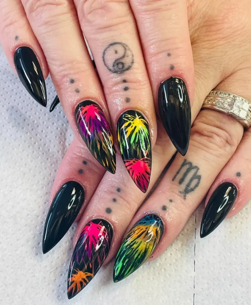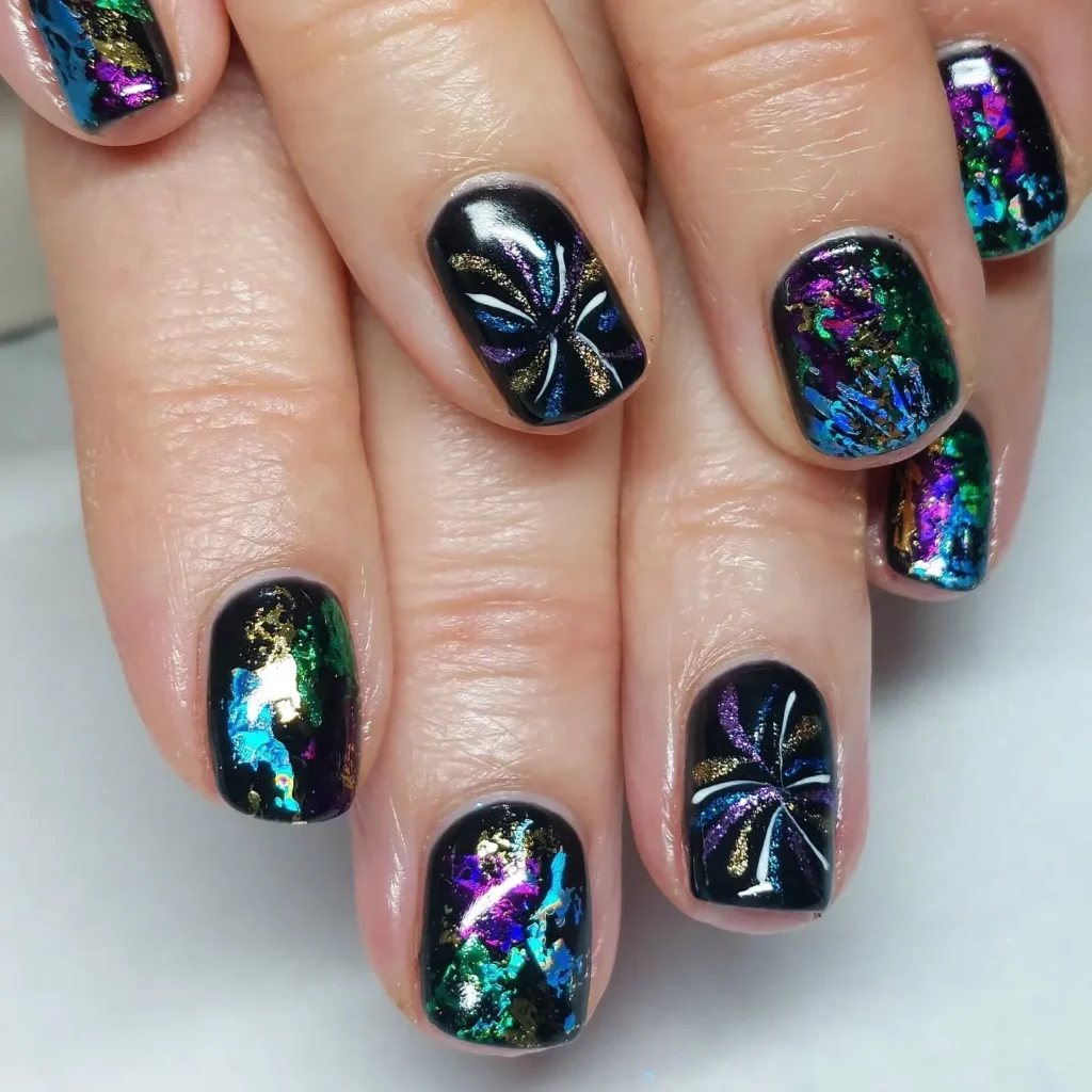 These nails feel cosmic. Rich dark tones paired with glowing, colorful bursts give total galaxy-meets-fireworks vibes. Every nail looks like its own little universe.