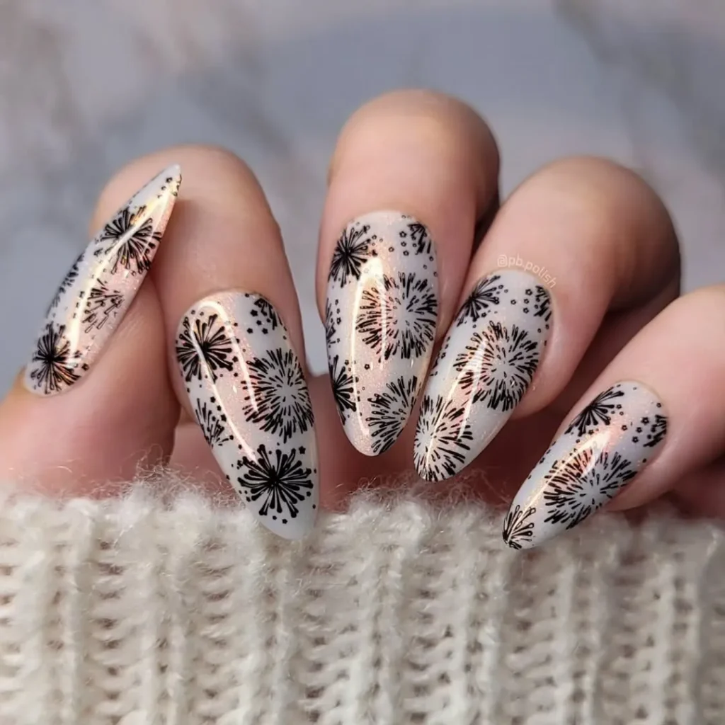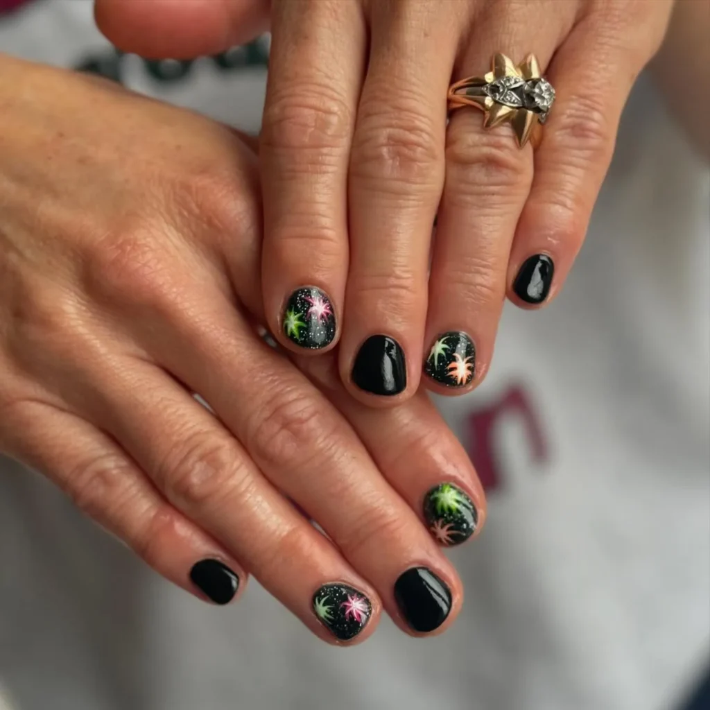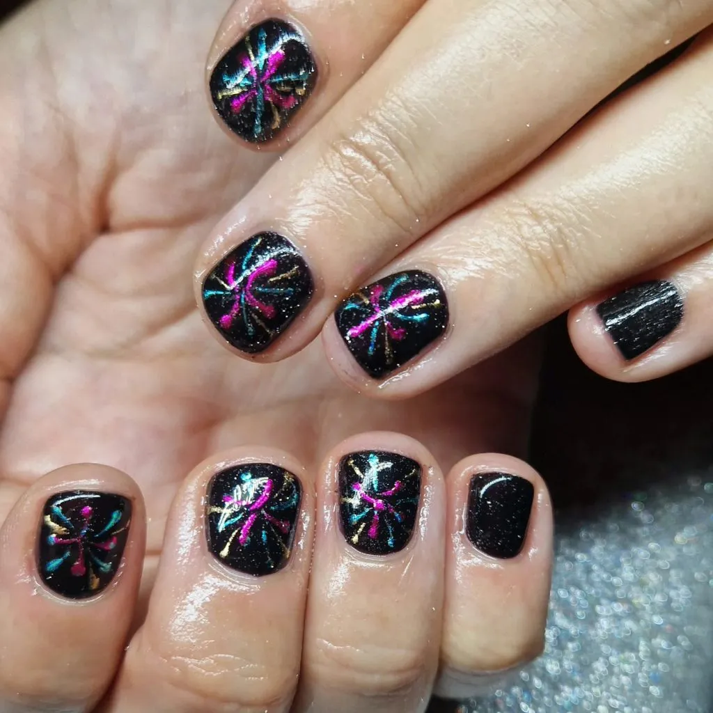This design feels clean and modern. The dark polish keeps things sleek, while the small firework accents add just the right touch of fun.