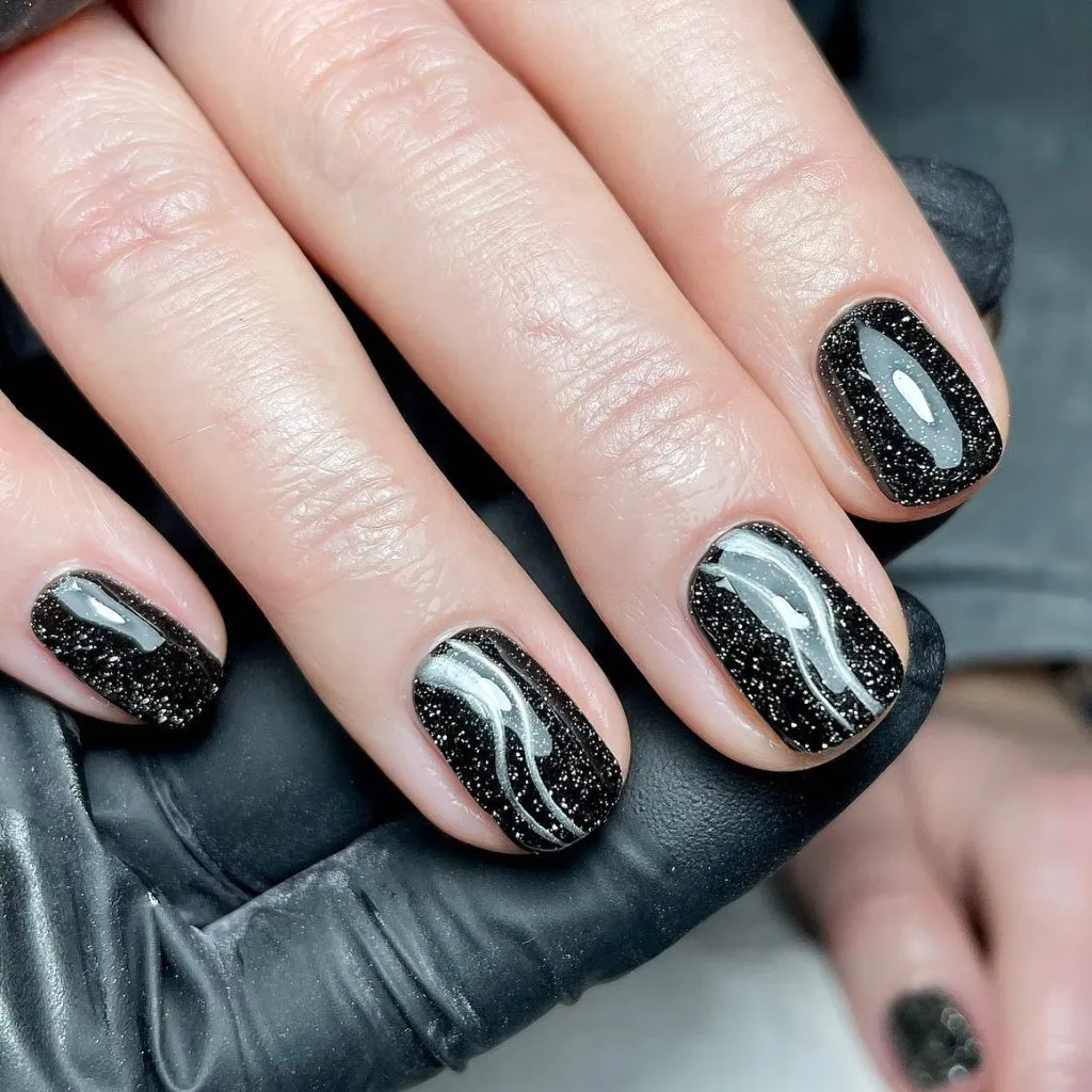 These nails are subtle in the best way. Fine spark trails over a black base look like fireworks just after they bloom—soft, glowy, and a little mysterious. It’s quiet drama, not screaming for attention but definitely holding it.