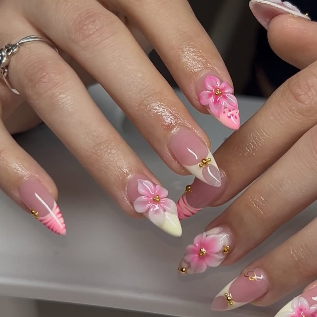If you love a classic French manicure but want something softer for spring, this version is such a beautiful twist. The delicate pink blossoms layered over the translucent base feel light and refined.