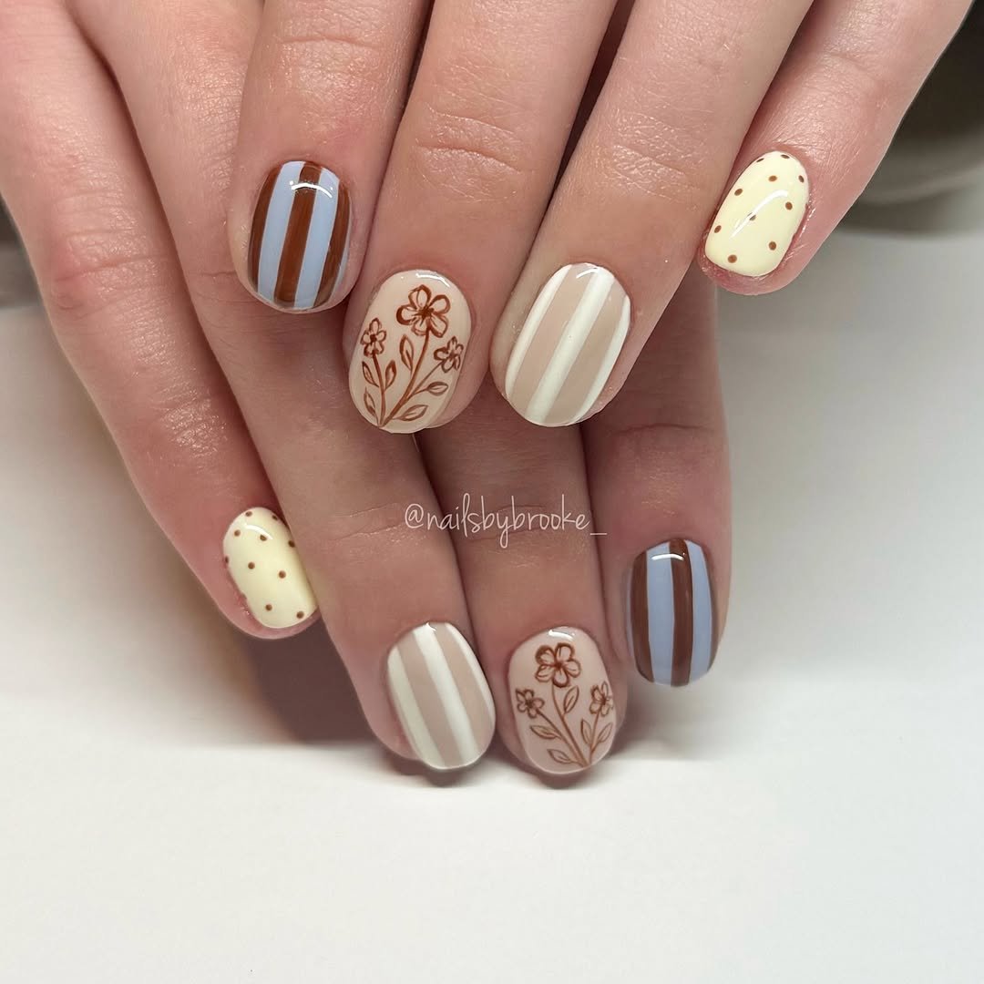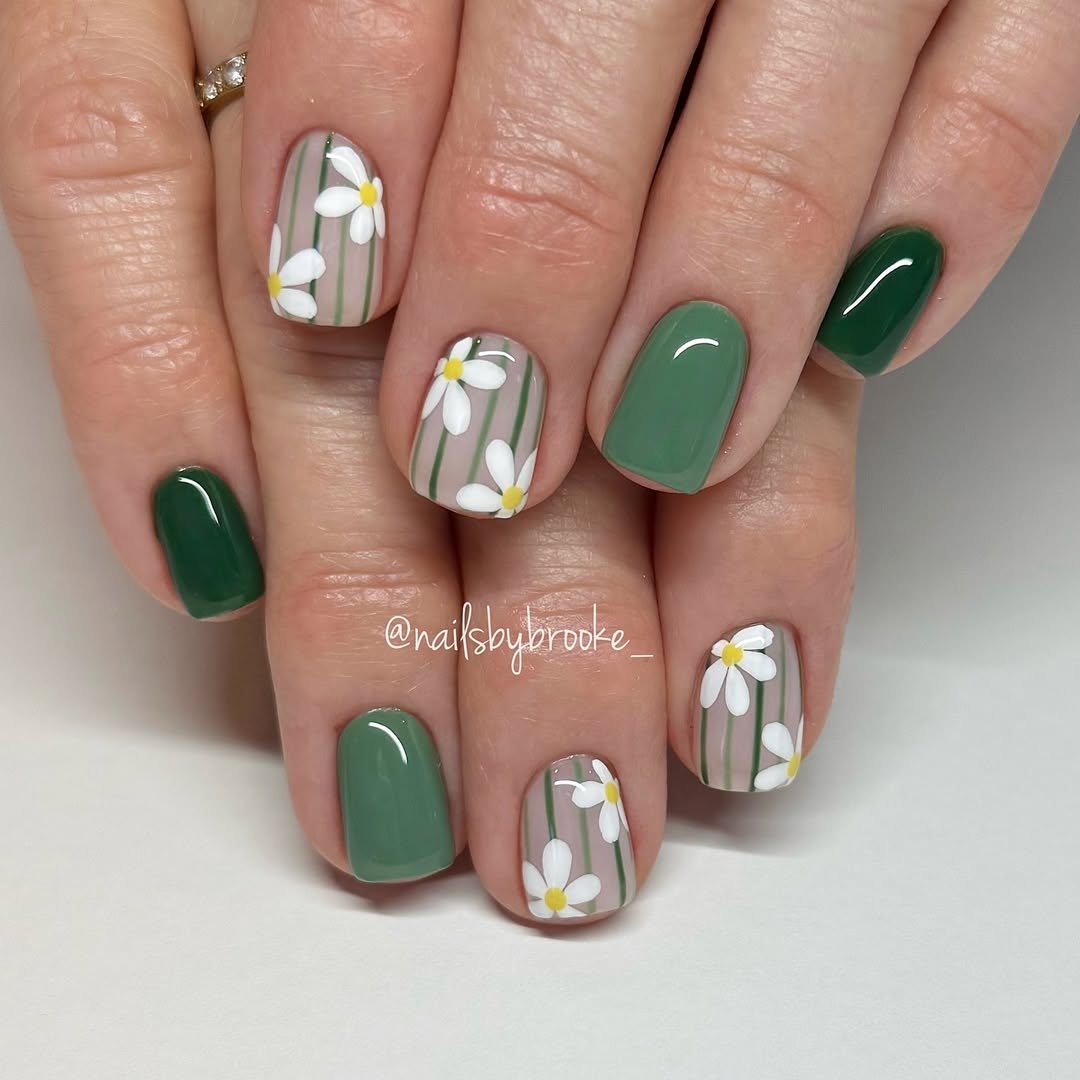 This manicure brings a little cottage garden energy to your fingertips. Soft sage green nails sit beside striped bases decorated with simple white daisies, creating that relaxed countryside feel.