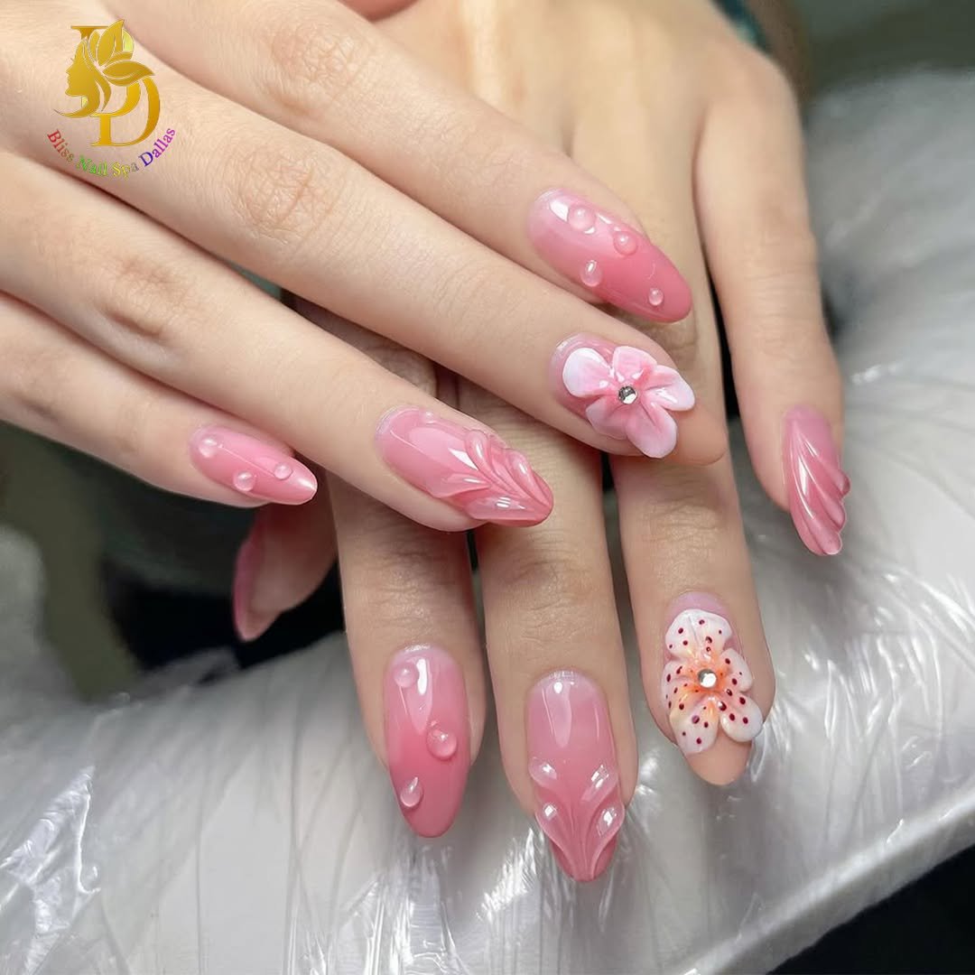 These nails are all about texture and shine. The glossy pink base already feels dreamy, but the sculpted petals and water droplet details bring a whole new level of dimension.