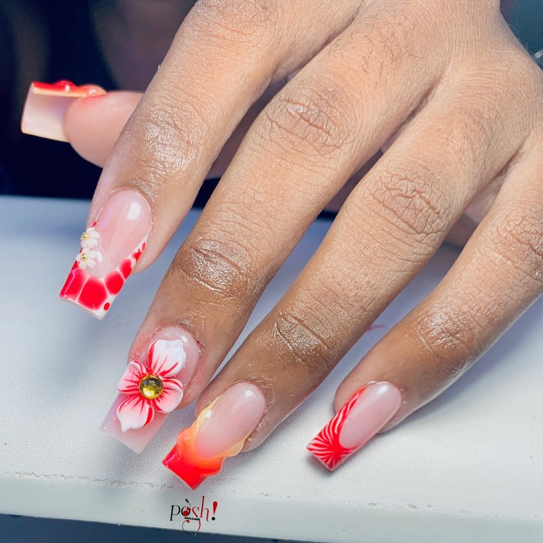 The sculpted hibiscus flower steals the show, sitting proudly on one nail like a tropical bloom. It adds just enough drama to elevate the design, while the rest of the nails keep things sleek and balanced.