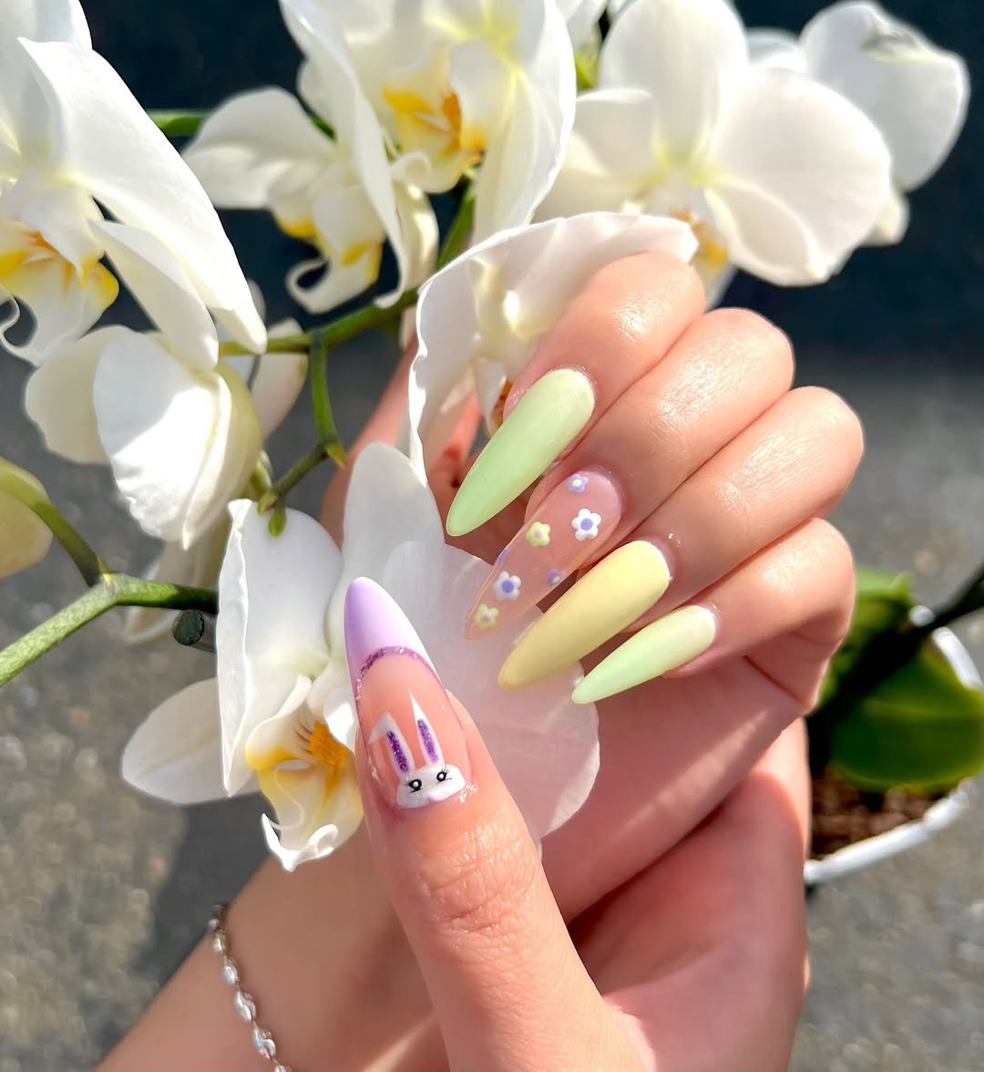 What I love here is the balance. The pastel palette keeps everything light and airy, while the illustrated details add personality. If you’re leaning into spring nails but want something that feels sweet rather than over-the-top, this kind of mix-and-match storytelling is the way to go.