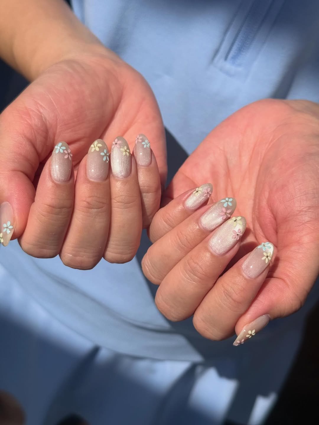 These nails feel like a quiet spring morning, soft light, blooming gardens, and just a hint of shimmer catching the sun. The pearly base creates that glazed, almost dewy finish, while tiny pastel daisies scatter gently across the tips like confetti from a garden party.